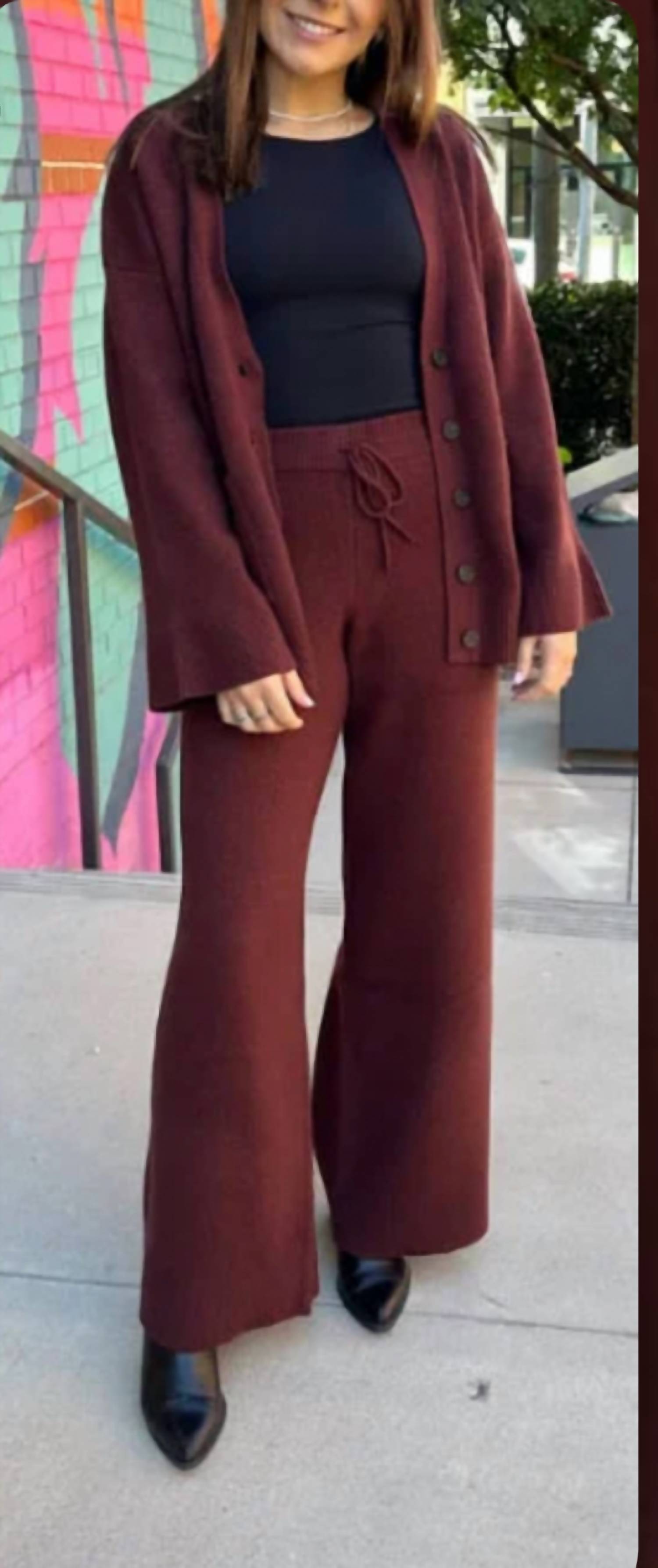 These wide leg pants are perfect for complementing a simple sleeveless top and a statement necklace. Pair it with the Jolie Cardigan for the coziest, put together look.Inseam: 28", Rise: 12.5", Leg Opening: 12"Turn garment inside out. Machine wash cold water with like colors. Gentle cycle. Tumble dry low. Do not bleach. Cool iron if needed.