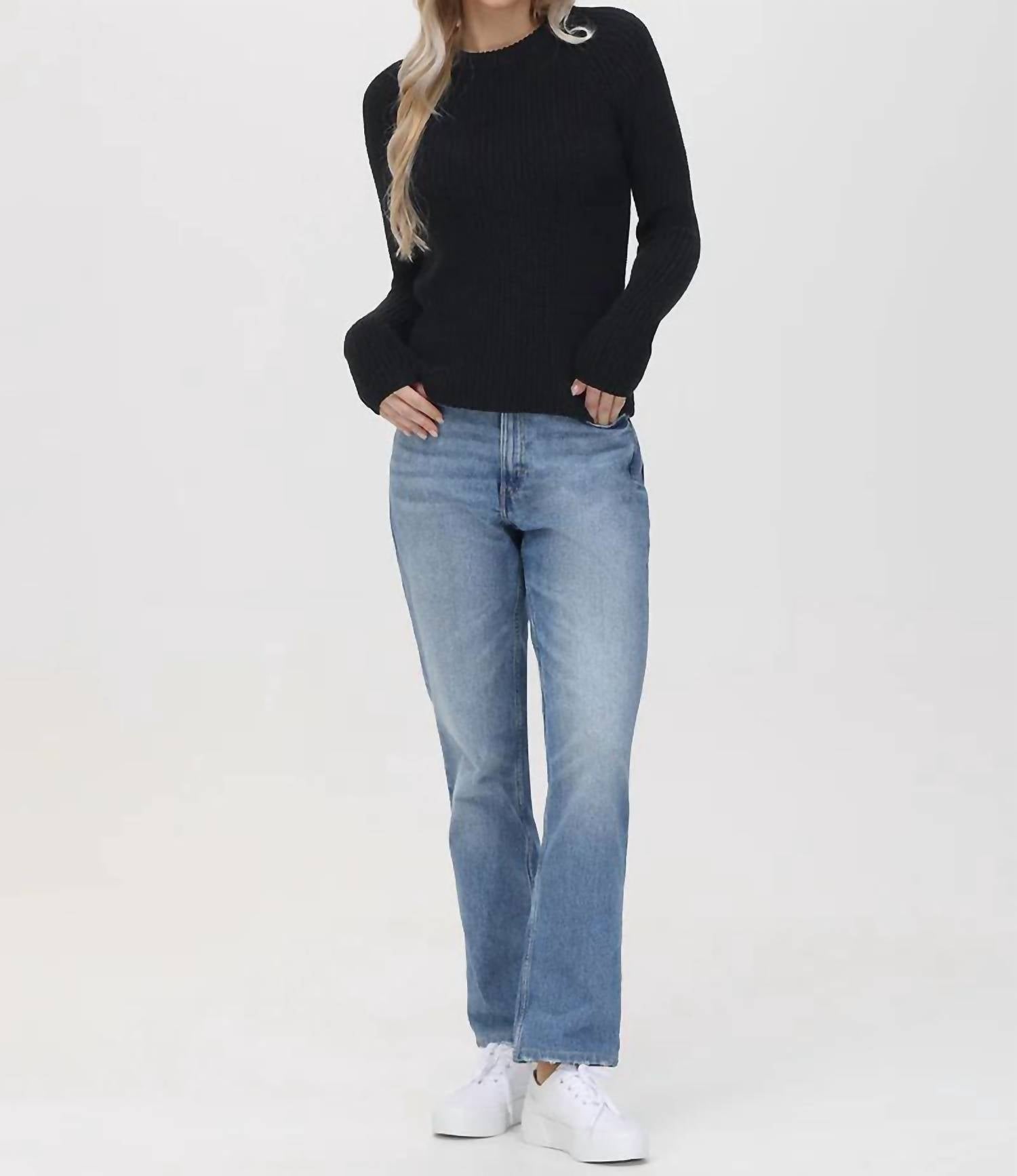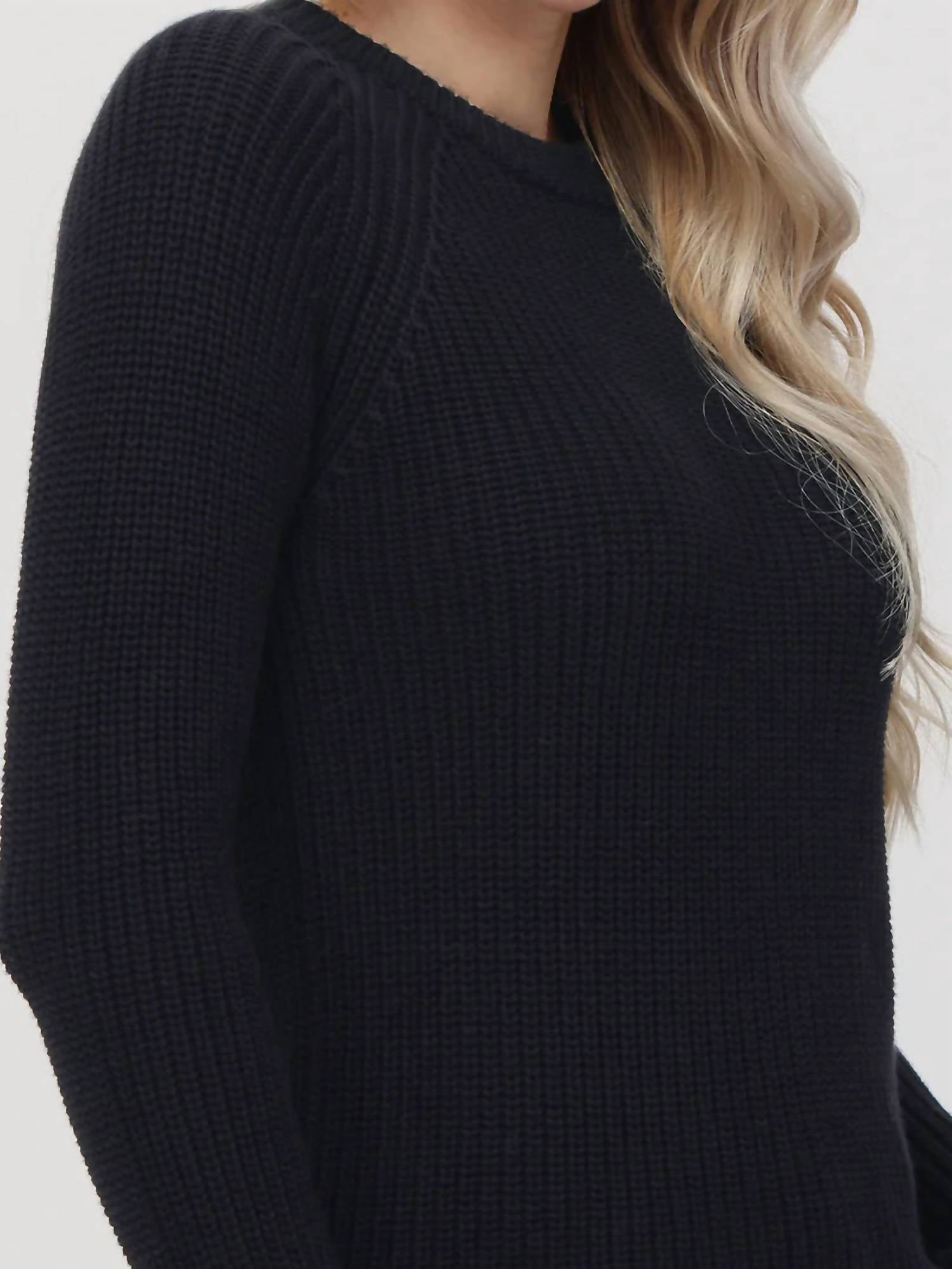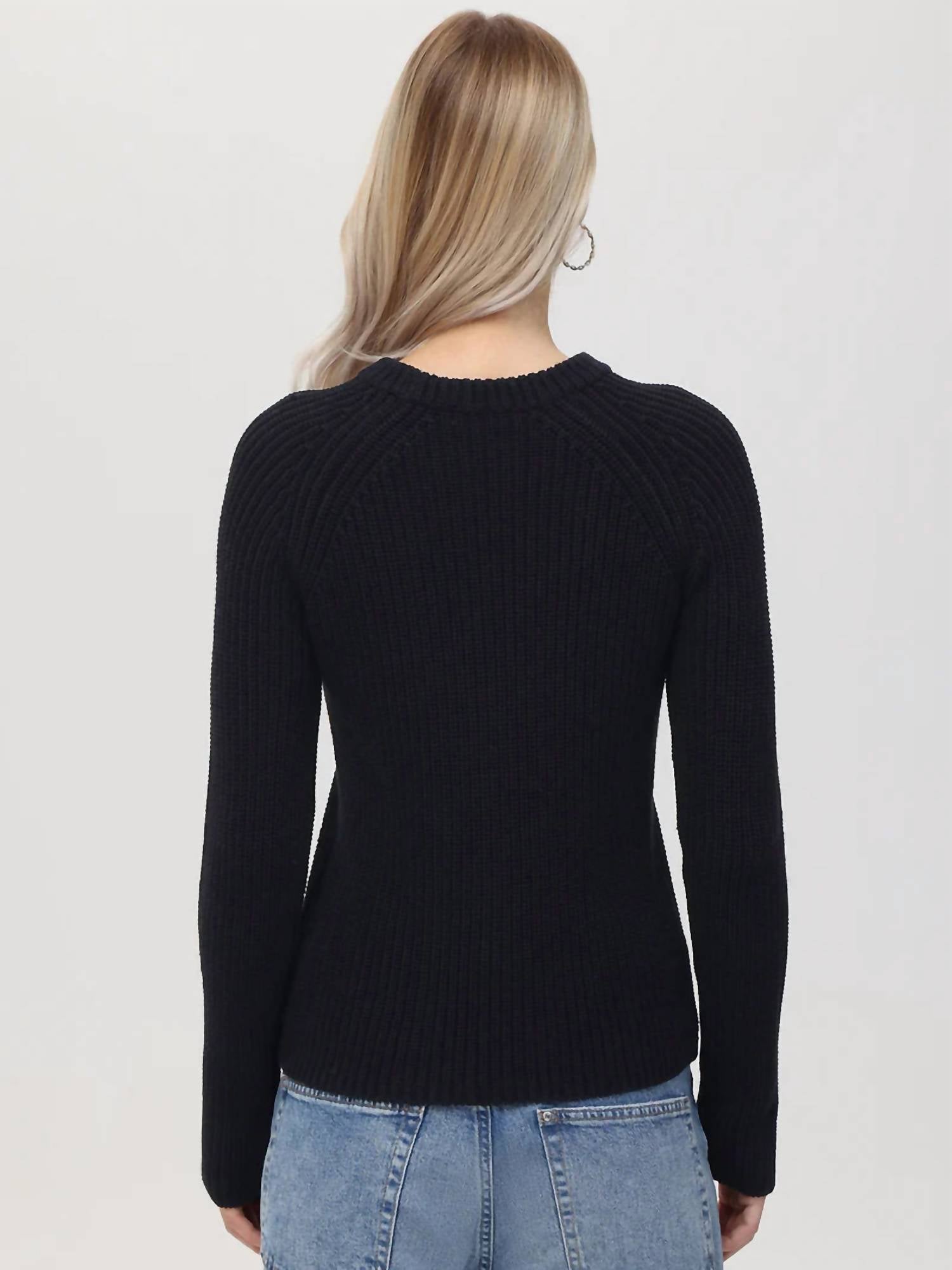 Elevate your wardrobe with the Jane Cotton Shaker Crewneck Sweater by 525 America, a refined piece perfect for any season. It boasts long sleeves with a sporty raglan design and a solid black hue for versatile styling. This pullover sweater has a fitted silhouette that's both comfortable and chic. For effortless care, simply machine wash and tumble dry low.