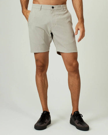 Introducing the Oxygenate Short by 7Diamonds, a solid sand-colored men's essential perfect for Game Day and Easter. Featuring a flat-front design with an inseam of 7 inches, these shorts are crafted from 53% recycled polyester, 43% elastomultiester, and 4% elastane, ensuring water resistance, quick-dry, and moisture-wicking properties. They offer a button closure for convenience and are tailored with functional pockets. Care is simple with machine wash cold and tumble dry low instructions, making these shorts an easy-care, minimalist staple for summer. Model is 6'1" and wears a size 32.