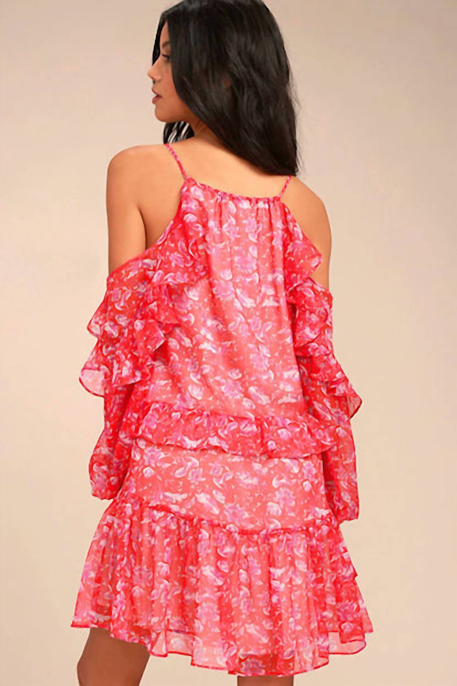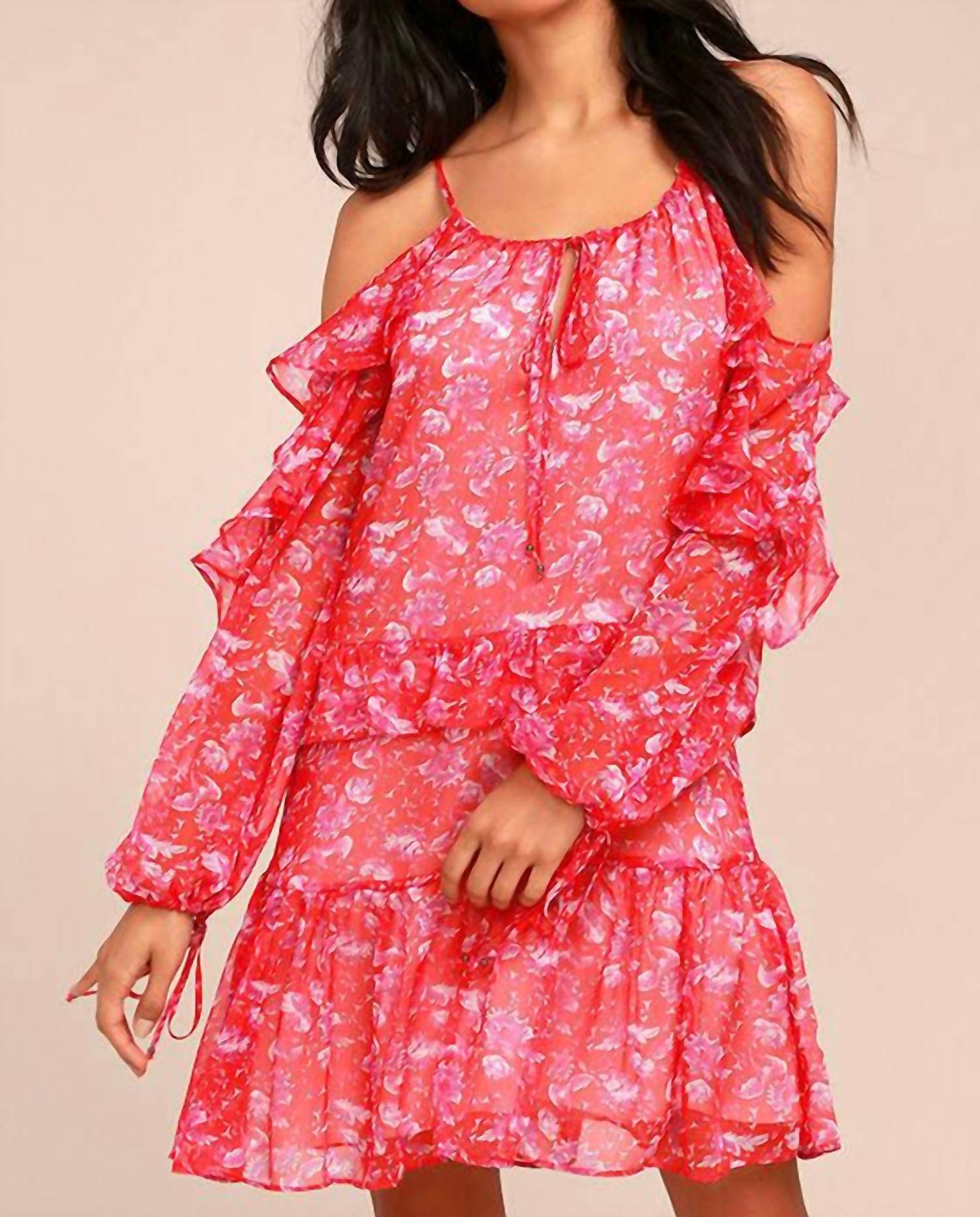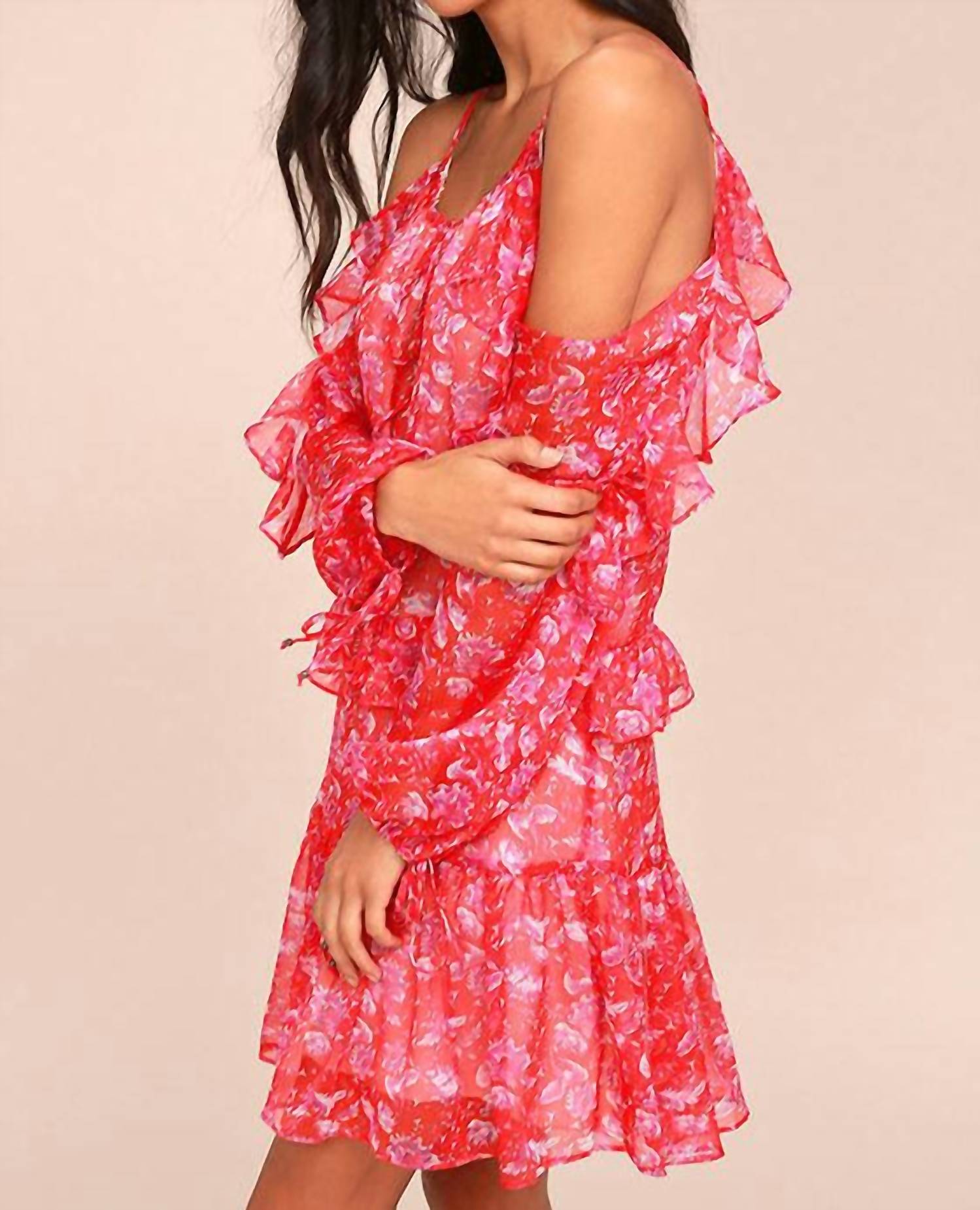 Embrace vibrant style with the Adelyn Rae Kaileen Mini Dress, an embodiment of playful elegance perfect for spring. This dress showcases long, cold-shoulder sleeves adorned with ruffles and tying cuffs and features a scoop neck. Crafted from 100% polyester in a captivating red, white, and purple floral pattern, it offers a full, tiered skirt that adds a touch of whimsy. Closure: Pull on. Care: Dry clean only.