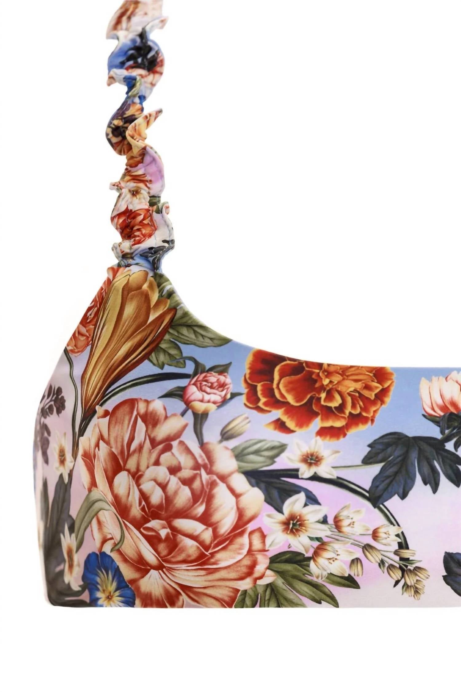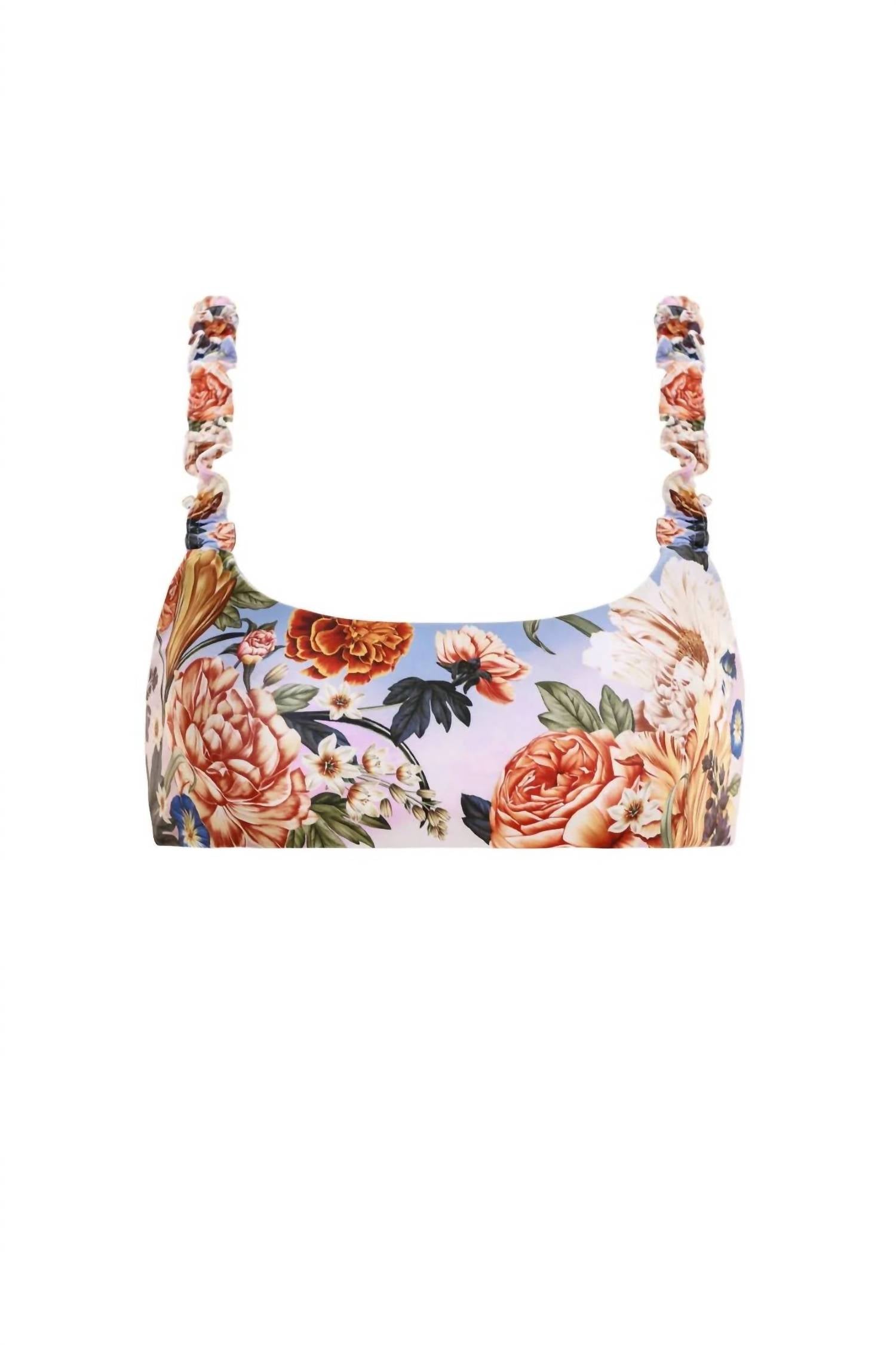 This cute and flattering swimsuit is perfect for making a splash at the pool, lounging on sun-kissed beaches, and staying stylish throughout the upcoming summer season.Discover versatility and charm with the Evie Bikini Top. Trimmed with ruffled straps and decorated in our delicate garden print, this adjustable sporty top boasts a unique handmade appeal, perfect for your beach adventures. Ruffled straps. Placement print. Upf 50+. Material: 81% recycled polyester, 19% elastane. The model is wearing a size small height: 71" / 180 cm. Bust: 32" / 81 cm. Waist: 24" / 61 cm. Hips: 35" / 89 cm.
