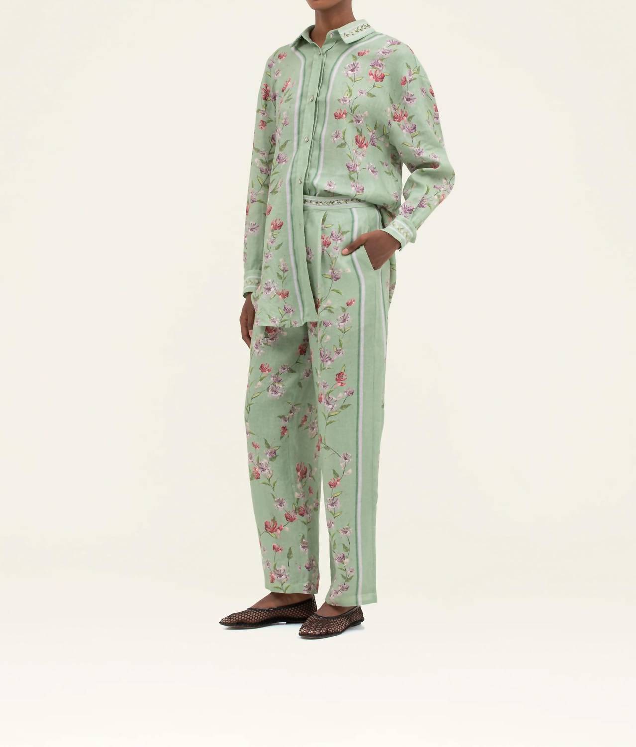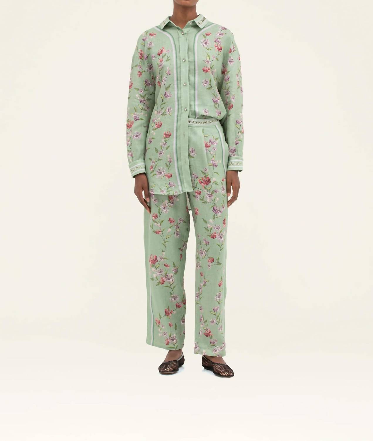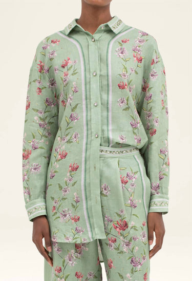 Elevate your wardrobe with the Cecilia Honeysuckle Button Down Top by Agua by Agua Bendita in a chic sage floral print. Crafted from 100% linen, this long-sleeve shirt combines style and comfort effortlessly. Closure: Button closure. Care: Dry clean only. The model is 5'9" and wears a size extra small.