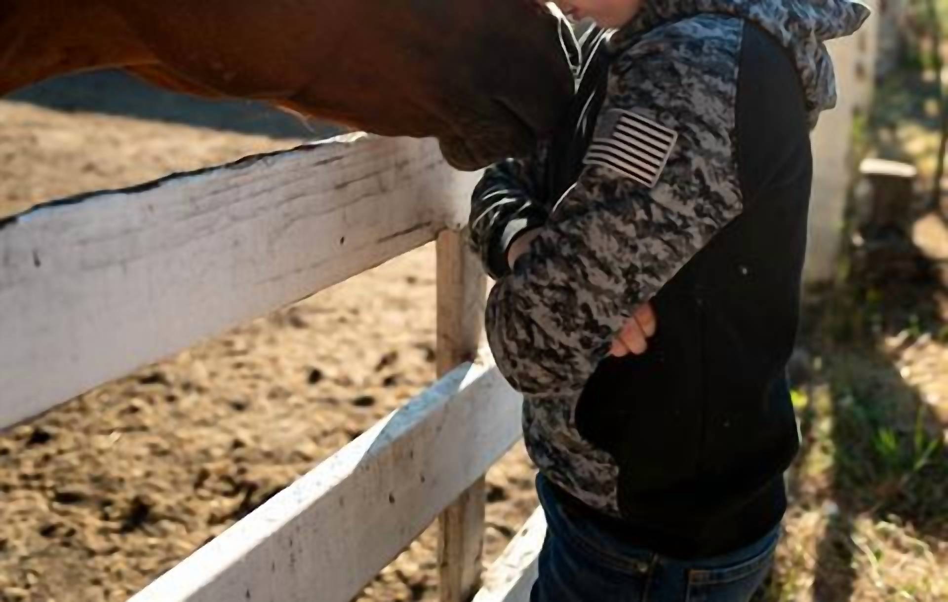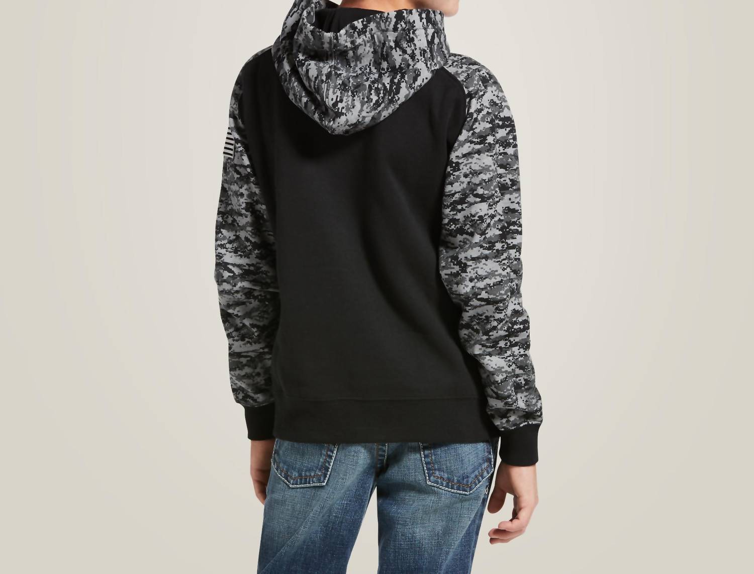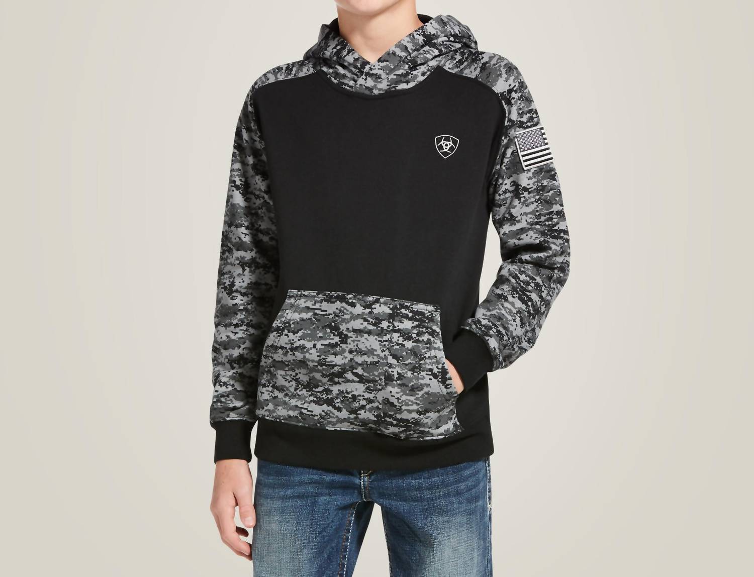 Introducing the Kid's Patriot Hoodie by ARIAT, a stylish and cozy choice for fall adventures. This hoodie features an eye-catching camo print contrast and an embroidered US Flag applique. Crafted with peached fleece, it includes a kangaroo pocket for added convenience and ribbed cuffs and hem for a snug fit. Origin: Imported.