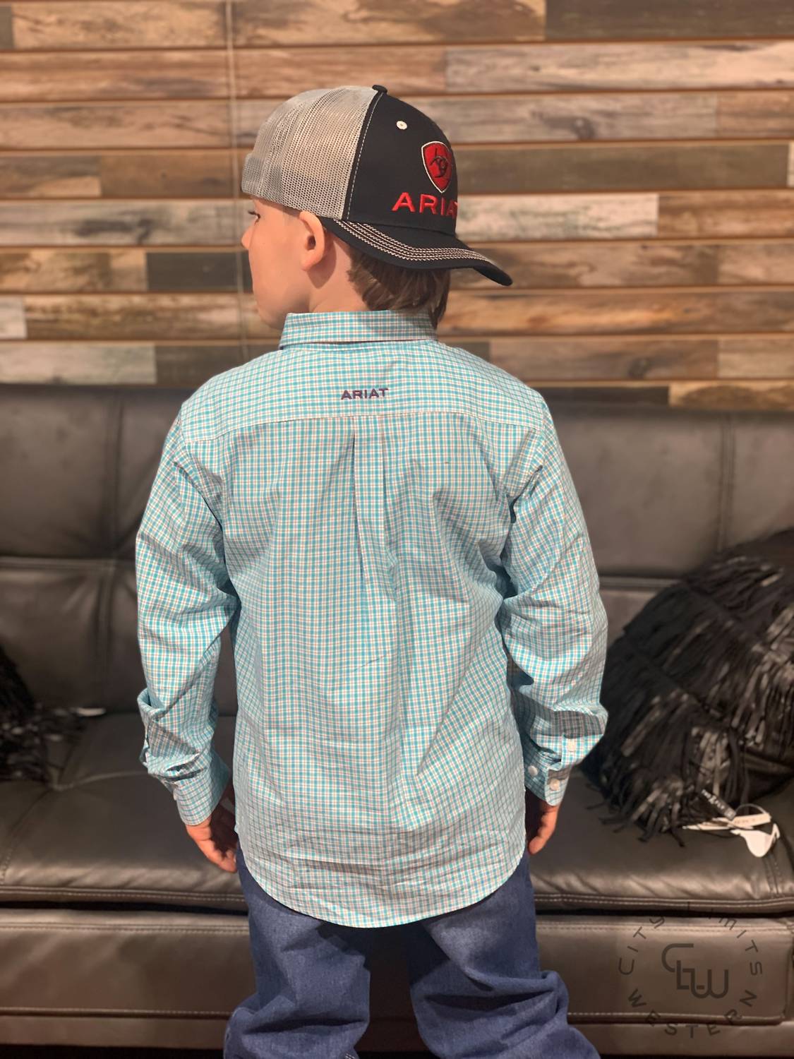Introducing the Kid's Pro Series Wilmer Classic Fit Shirt by ARIAT, a perfect choice for spring holiday parties. This light blue, button-down shirt features a classic plaid and check pattern, tailored for boys. Ideal for a refined and stylish look, it's crafted for occasions that demand both comfort and a touch of sophistication. Note: Dry and wash instructions are not provided.