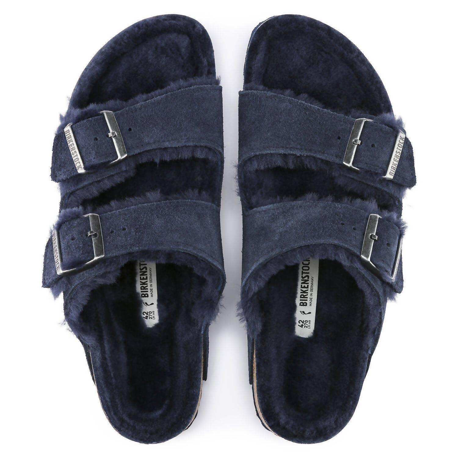 Embrace comfort and style with the Women's Arizona Fur Shearling Sandal by BIRKENSTOCK, crafted in Germany for a winter-ready wardrobe. Featuring an open toe design and flat heel, this midnight-colored sandal is made with high-quality suede and genuine shearling lining for extra coziness. The anatomically shaped cork-latex footbed and EVA sole offer unparalleled support, while two adjustable lambswool-lined straps with metal pin buckles ensure a personalized fit. Ideal for streetwear or vacation settings, these sandals cater to a medium shoe width.