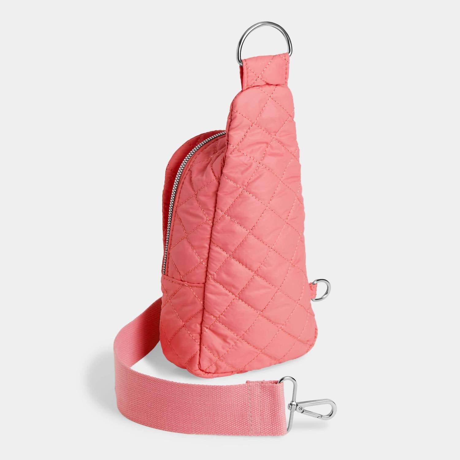 Meet the Salmon Pink Rhea Nylon Puffer Crossbody Sling Bag by COCO + CARMEN, a chic and functional accessory for any outing. Constructed from quilted nylon puffer material, this bag measures 6" in width, 12.5" in height, and 2" in depth, offering ample organized storage with a snap pocket on the front and interior card slots. Its matching woven strap is both adjustable and detachable, featuring metal hardware for durability. Perfect for those who desire style and practicality.