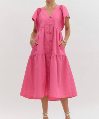 Introducing the Bold And Beautiful Button Dress by Entro, a standout piece in a solid pink hue designed for cocktail parties. This fit and flare midi dress features short flutter sleeves and an elegant V-neck, providing both style and comfort. With its oversized front button closure and practical side pockets, it combines functionality with fashion. Made from a blend of 80% polyester and 20% cotton, this lined dress is perfect for spring occasions.