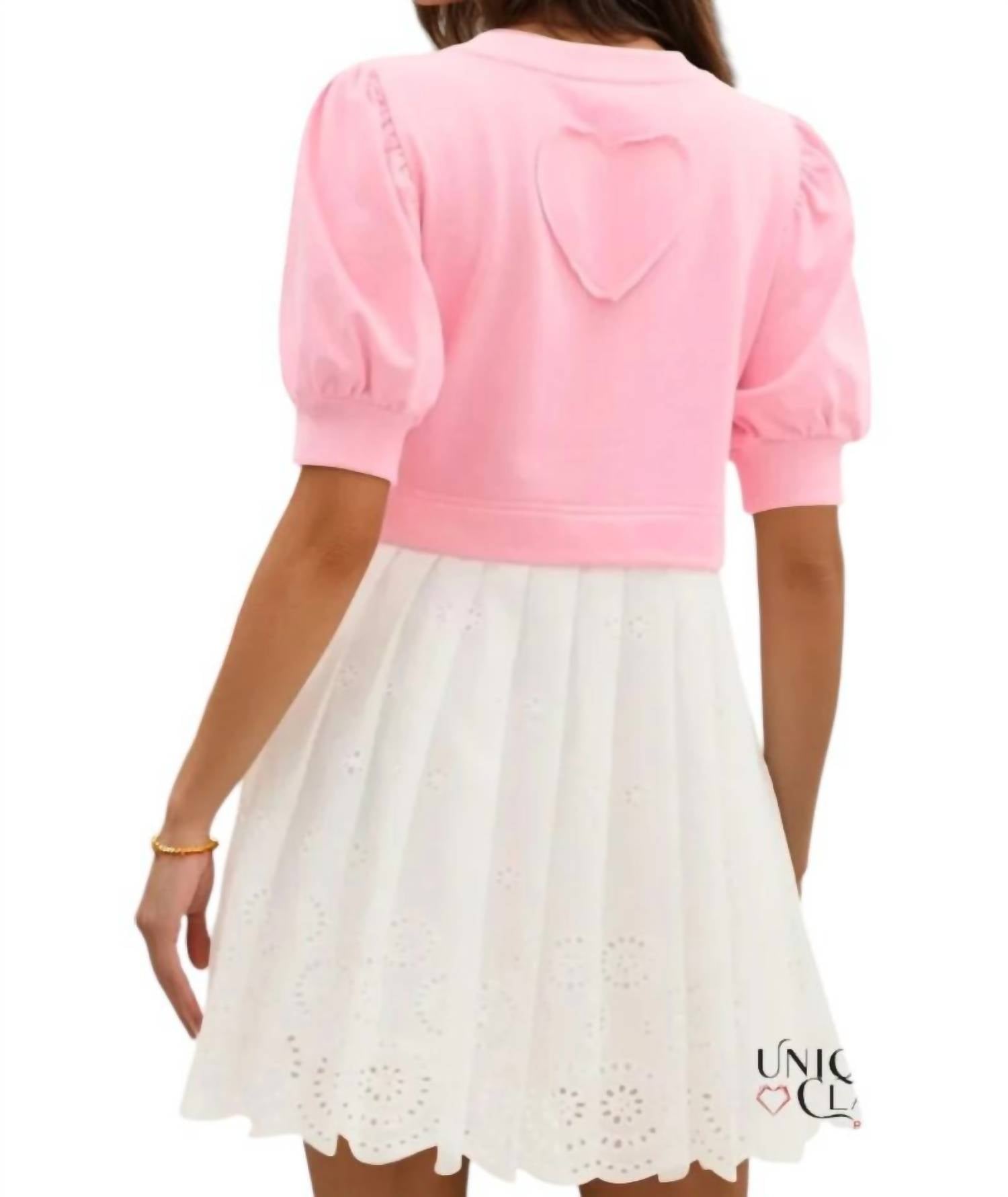 Chic and charming dress. Features short puff sleeves in a soft terry pink knit top. Pull-on design, beautifully transitioning to a delicate white eyelet skirt. Crafted from 95% cotton and 5% spandex, lined for comfort. Has practical side pockets. Hand wash cold, do not bleach, hang to dry, do not dry clean. Fits true to size.