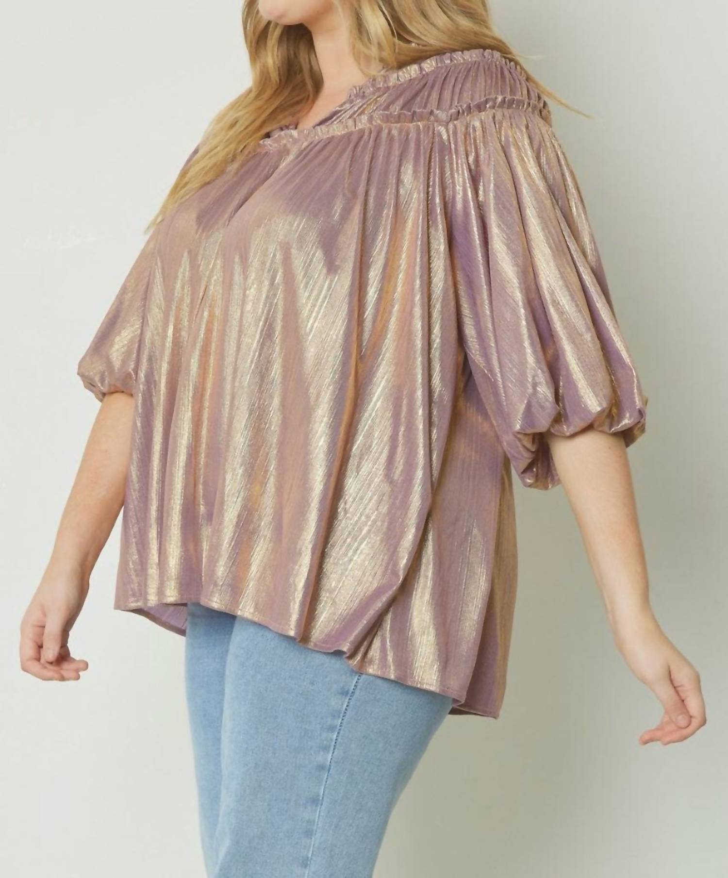 Introducing the Entro Chrome Bell Sleeve Tunic, a chic choice in a captivating lavender and gold chrome hue. This women's blouse features elbow-length puff sleeves and a stylish V-neck with a ruffled trim, offering a loose and flowy fit that's perfect for both casual and evening wear. The solid metallic sheen adds a touch of glamour, enhancing its versatile appeal. Closure: Pullover style.