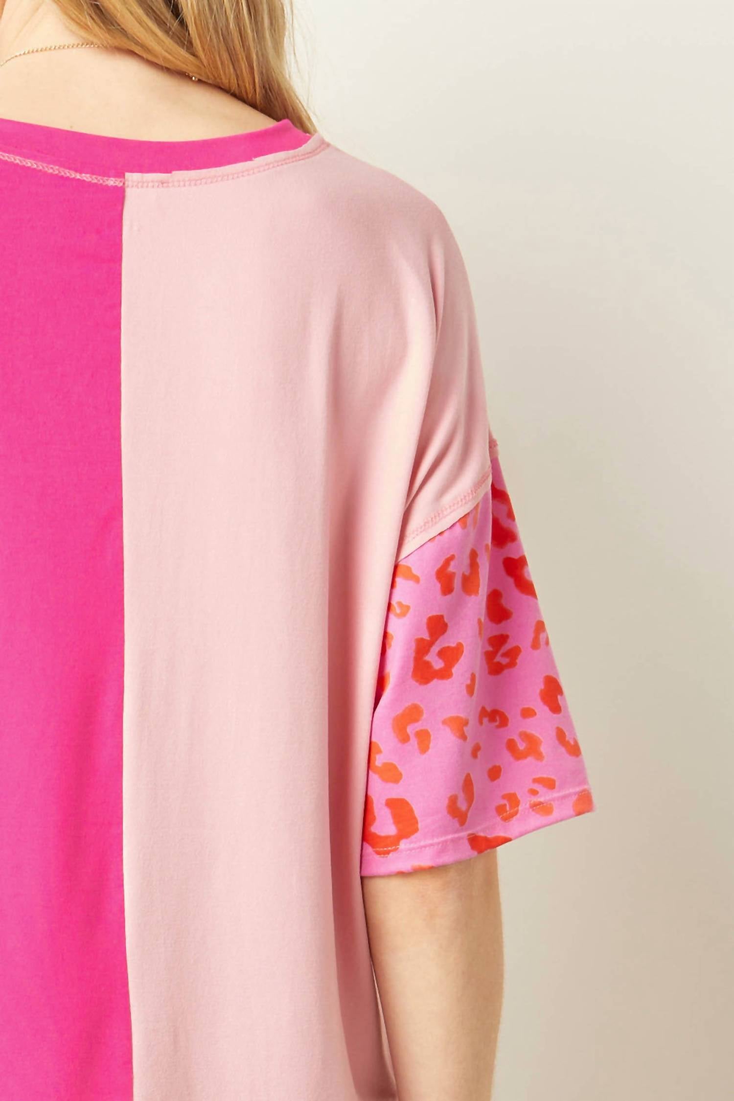 Upgrade your casual wardrobe with the Entro Color Block Leopard Top in a playful pink hue. This top is designed with a V-neckline and elbow-length sleeves, featuring a trendy leopard print and color block design for a relaxed silhouette. Made from a blend of 96% polyester and 4% spandex, the fabric is soft, lightweight, and stretchy, ensuring comfort and style. Originating from the USA, it offers a convenient pull-on closure and should be hand washed or dry cleaned for lasting wear. Lengths range from 27" to 30" based on size.