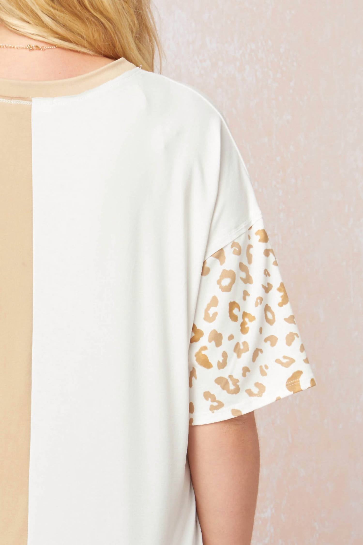 Introducing the Entro Color Block Leopard Top, a trendy camel blouse designed for those seeking style and comfort. This top features short sleeves, a playful leopard print, and a relaxed V-neckline, complemented by outside seams and a color block design. Made from a soft and stretchy blend of 96% Polyester and 4% Spandex, it offers a flattering silhouette with dimensions available up to a 2X Bust 52" and Length 30". Crafted in the USA, this pull-on blouse is best maintained with a hand wash or dry clean.
