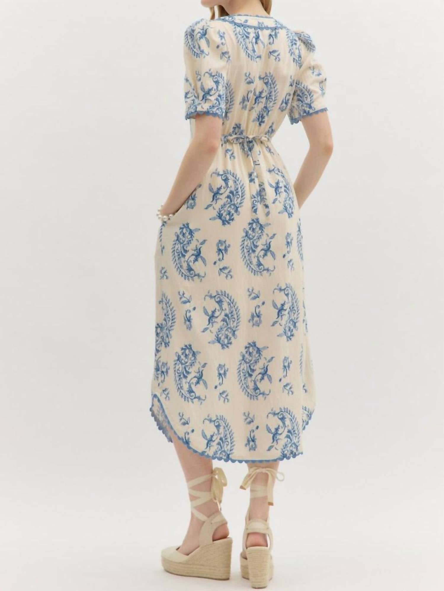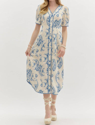 The Blue Ivory Damask Midi Dress by Entro is a stunning choice for any occasion. Featuring short puff sleeves and an elegant paisley print, this A-line dress is crafted from a composition of 80% Rayon and 20% Nylon. The dress showcases a v-neckline with an open styling and a front button placket adorned with detailed trim. Machine wash and tumble dry for easy maintenance.