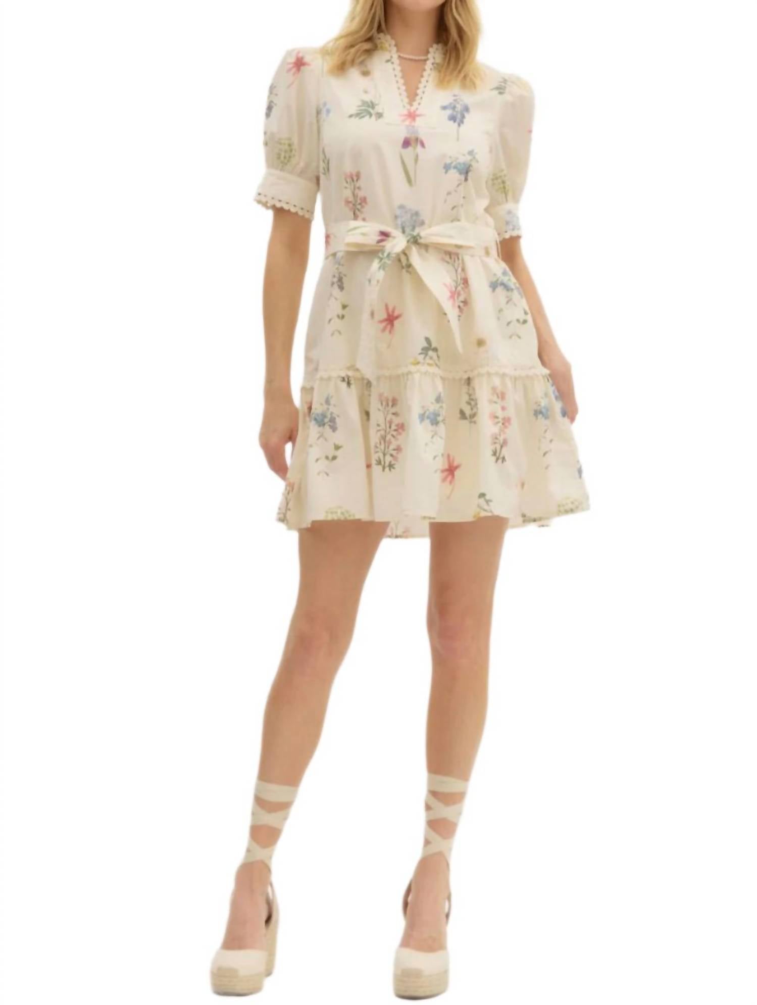 Embrace romantic charm with the Deadra Floral Puff Sleeve Dress by Entro, an ideal choice for women seeking a boho-chic vibe. This mini fit and flare dress showcases short sleeves in a delicate floral print against a classic black canvas. Made from 100% cotton and lined for added comfort, it features a pull-on closure and a removable self-tie belt to accentuate its flattering silhouette. The dress is crafted in China with thoughtful details like side pockets, perfect for effortless style. Care for it with a gentle hand wash and line dry to maintain its beauty.