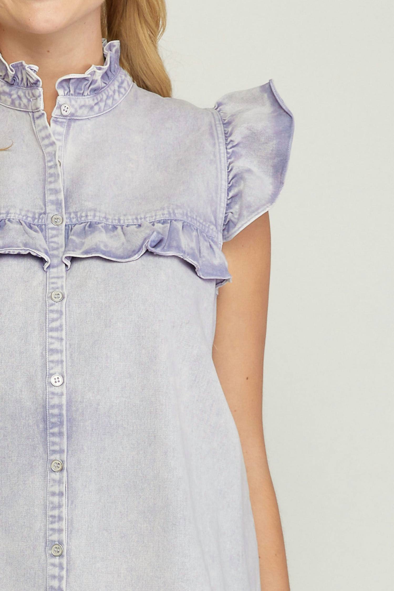 The Entro Denim Ruffled Top in Peri is a must-have, blending trend and comfort effortlessly. This women's top features stylish cap sleeves and a crewneck, detailed with a ruffle neckline and flutter sleeve design. Crafted from a blend of 65% Cotton, 32% Polyester, and 3% Spandex, it's both lightweight and allows for easy movement, thanks to its stone-washed, a-line silhouette with an elegant button closure. Care for this solid patterned piece with hand washing or dry cleaning to maintain its quality. Available in various sizes: Small (Bust 36", Length 25"), Medium (Bust 38", Length 25"), Large (Bust 40", Length 25"), XL (Bust 48", Length 29"), 1X (Bust 50", Length 29"), and 2X (Bust 52", Length 29").