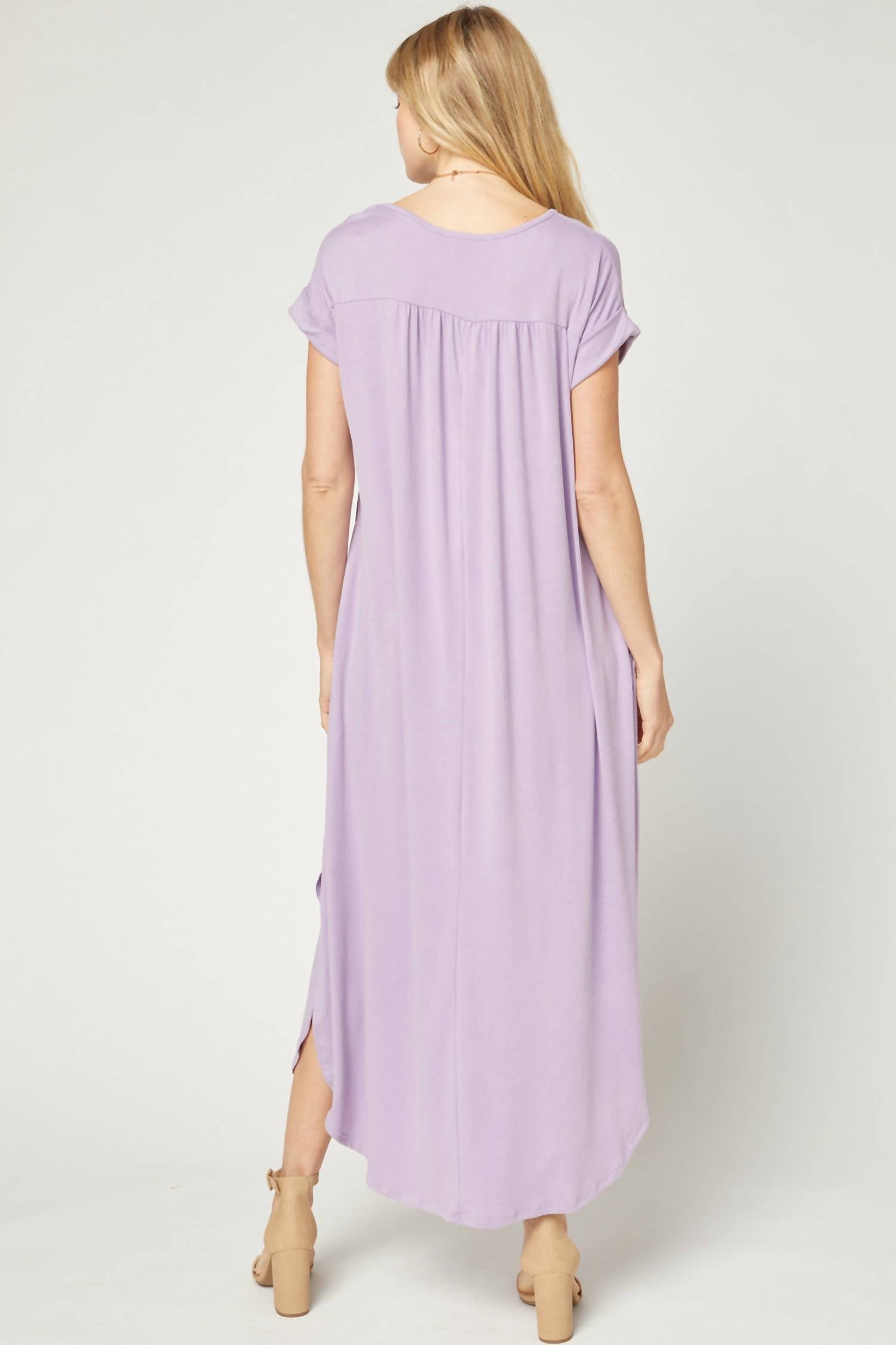 The Everyday Pocket Maxi Dress by Entro in lilac is your go-to for effortless style and comfort. Featuring short rolled sleeves and a V-neck, this dress offers a flattering a-line kaftan silhouette and practical side seam pockets. With a soft blend of 94% Polyester and 6% Spandex, this 51" dress is crafted in the USA with a convenient pull-on design. Care is simple with a recommendation for hand washing or dry cleaning to maintain its minimalist charm. Model is 5'8" and wears a size small.