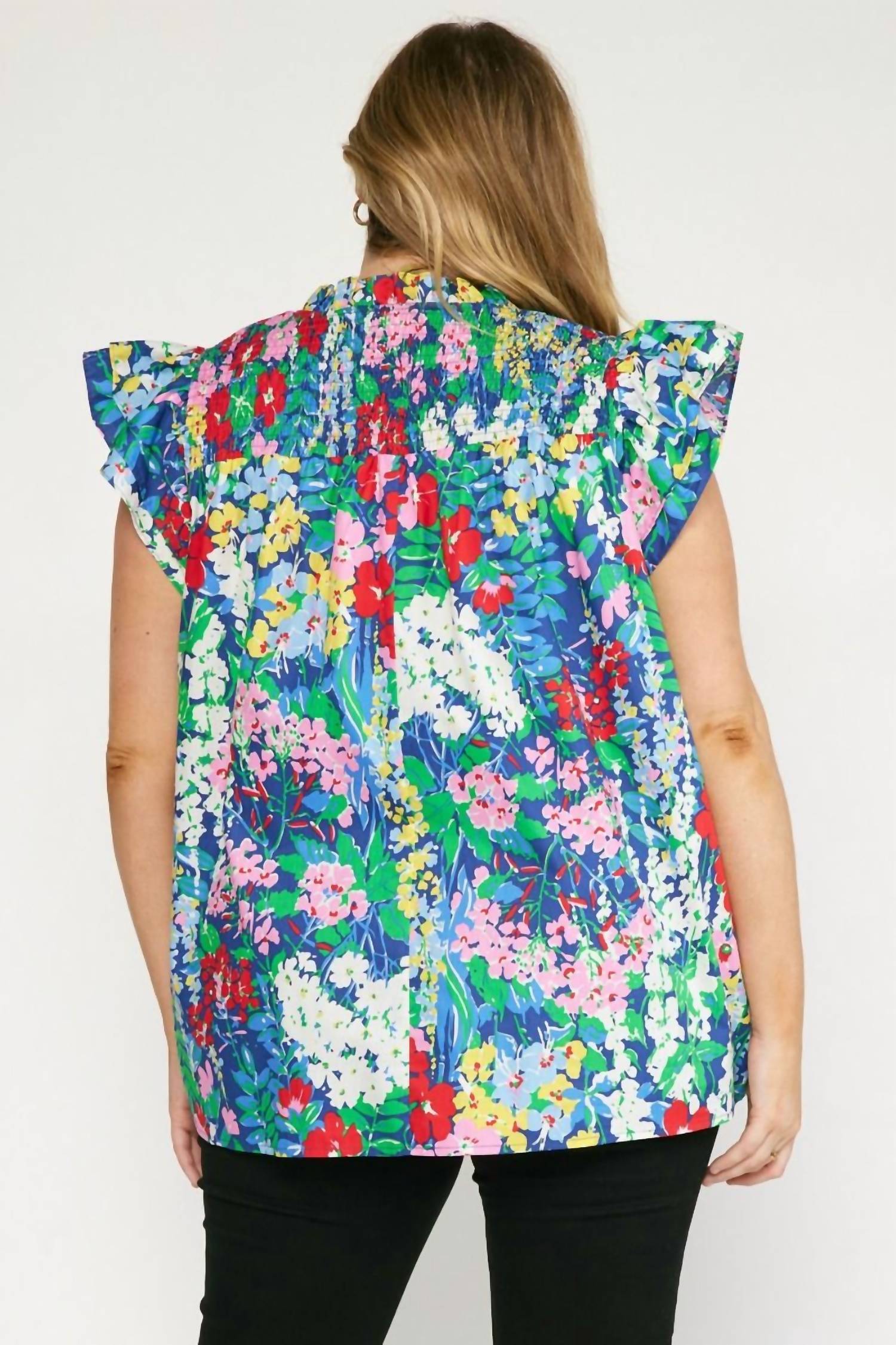 The Floral Ruffle Sleeve Top by Entro in Navy is a standout piece for any fashion-forward wardrobe. With cap sleeves, this blouse is made from 100% Cotton, promising both comfort and style in a classic A-line silhouette. Featuring a romantic floral print, smocking detailing, and an effortless pull-on closure, it's designed for a flattering oversized fit. Care instructions recommend hand wash or dry clean for longevity. Available in plus sizes: XL (Bust 48", Length 30"), 1X (Bust 50", Length 30"), 2X (Bust 52", Length 30").