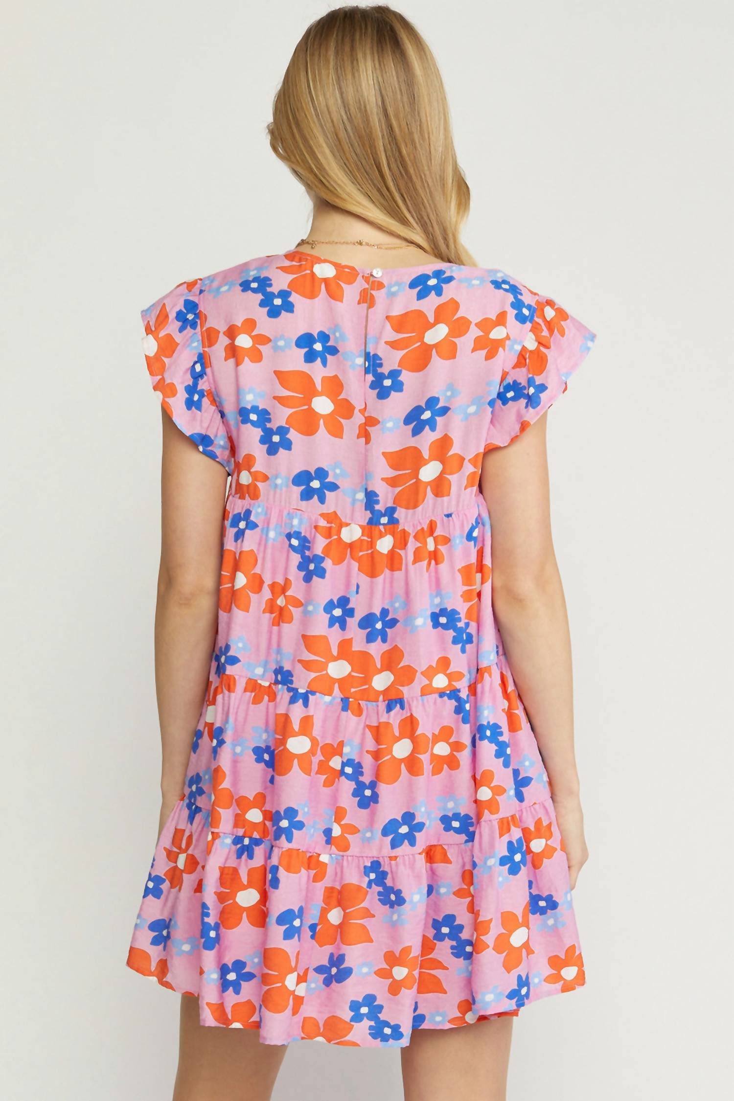 The Floral Tiered Babydoll Dress by Entro is a charming piece crafted for casual elegance. Designed in a lovely pink floral pattern, this mini dress features short ruffled sleeves and a flattering A-line silhouette. Its composition includes 80% Rayon and 20% Nylon, with a lining made of 100% polyester, ensuring comfort and style. Closure includes a button on the back, and it comes equipped with side pockets for convenience. Care for this garment by hand washing or opting for dry cleaning. Dimensions available: Small has a bust of 36" and length of 33", Medium has a bust of 38" and length of 33", Large has a bust of 40" and length of 33". Model is 5'9" and wears a size small.
