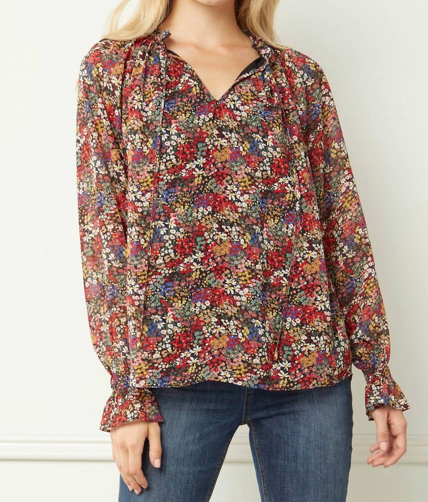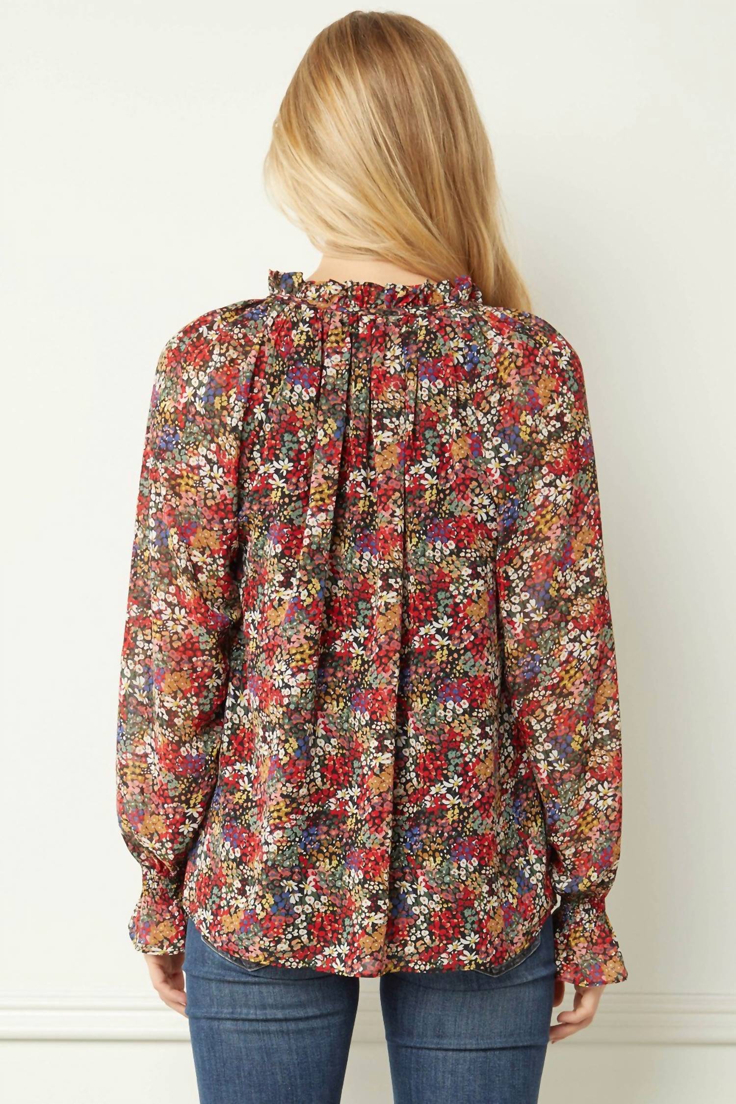 Elevate your wardrobe with the Floral V-neck Top by Entro, designed in a boho chic black floral print. This blouse features long semi-sheer sleeves, a V-neckline with a self-tie closure, and a ruffle detail at the neckline for added flair. Crafted from 100% polyester, it offers a flattering a-line silhouette and is lined for added comfort. Sizing varies from a bust of 38" to 50" and length options of 25" or 30". Care instructions recommend hand washing or dry cleaning for best results.