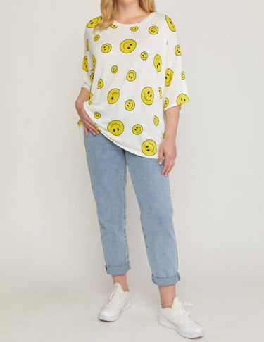 Meet the Happy Face Top by Entro, a standout choice for those looking to express their cheerful personality. This women's blouse in white is crafted from a lightweight knit composed of 96% Polyester and 4% Spandex. Designed with a round neckline, dropped shoulders, and three-quarter sleeves, it flaunts a playful smiley face graphic. The pull-on closure offers ease of dressing, and care is simple with options for hand wash or dry clean.