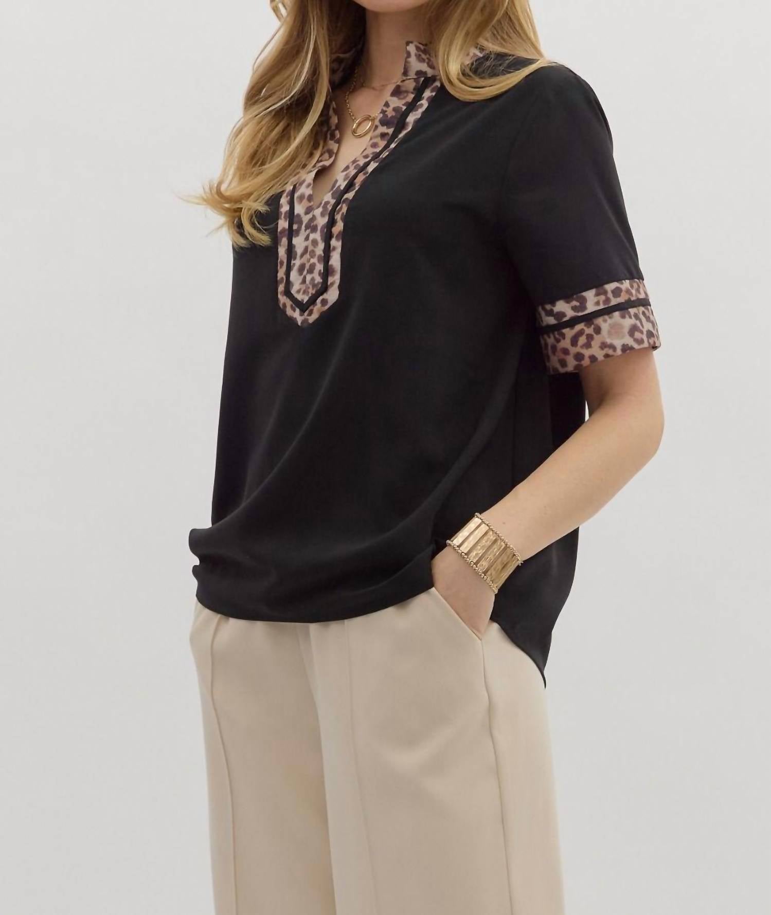 Meet the Leopard Accent Short Sleeve Blouse by Entro, a chic piece perfect for summer vacations with its minimalist design. Made from 100% polyester, this women's top features short sleeves and a distinctive caftan-inspired V-neckline with leopard pattern accents. Designed in a pull-on style, it offers a lightweight and non-sheer finish, making it both stylish and comfortable for warm weather wear. Care: Hand wash and line dry to maintain its quality and vibrant appearance.