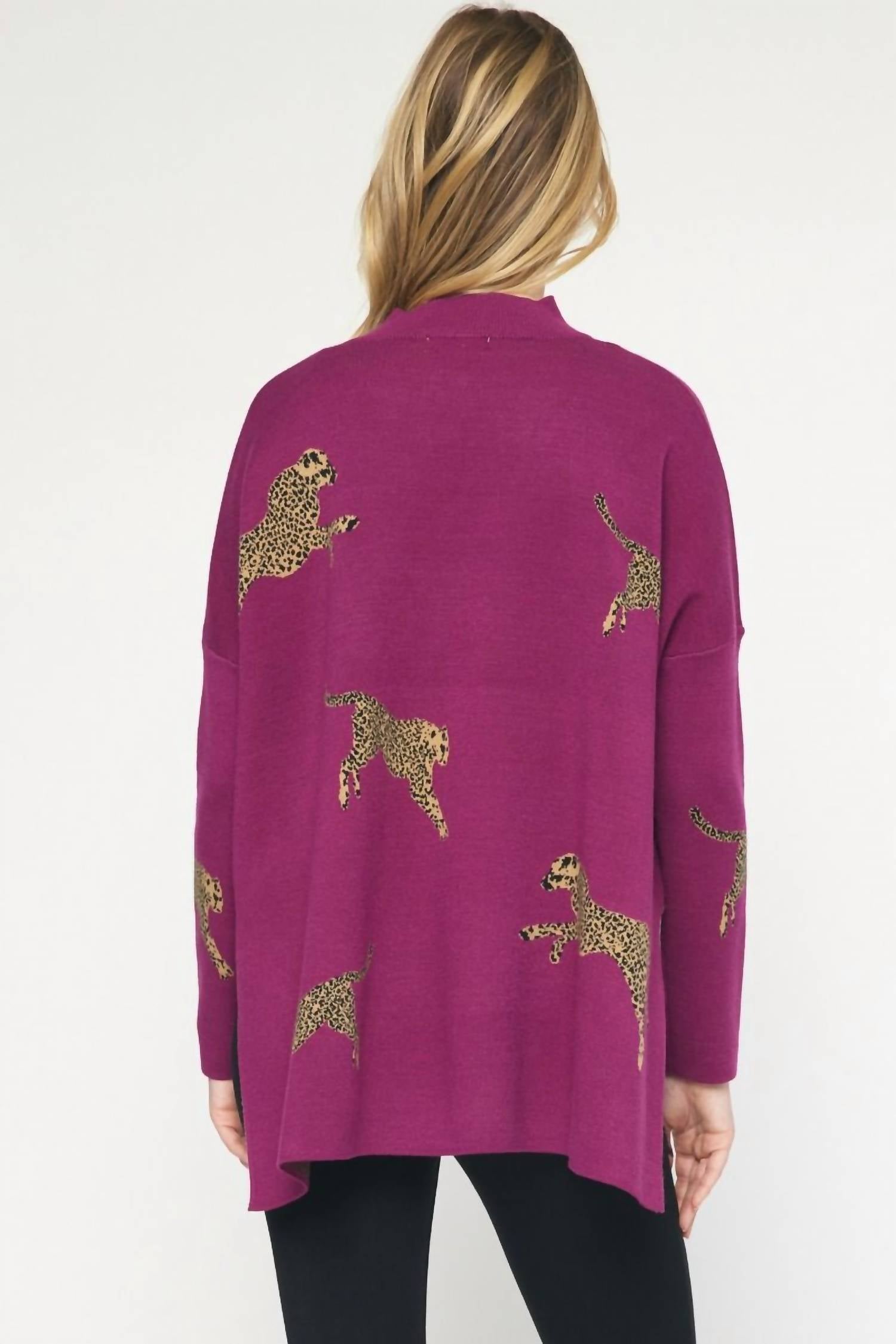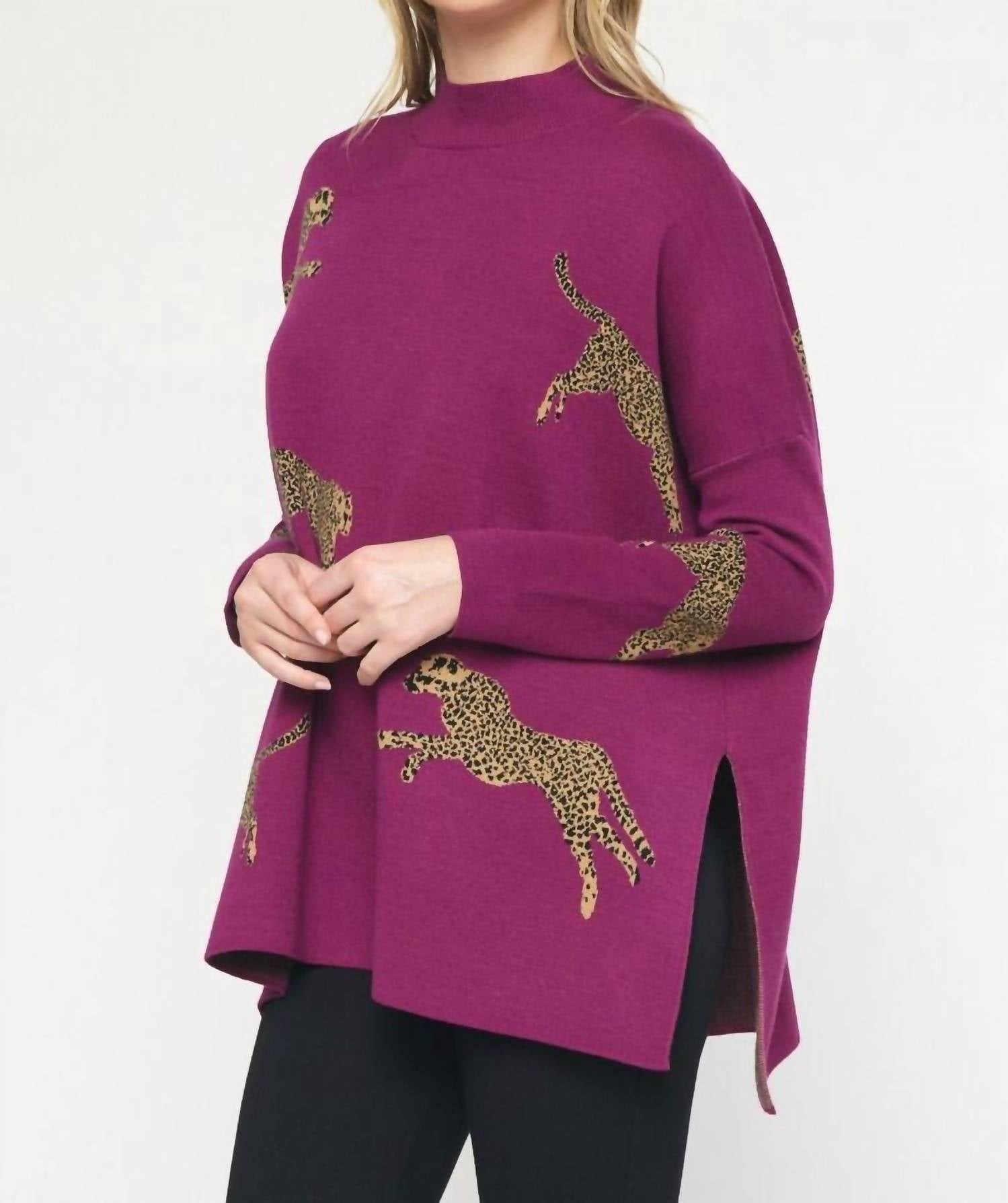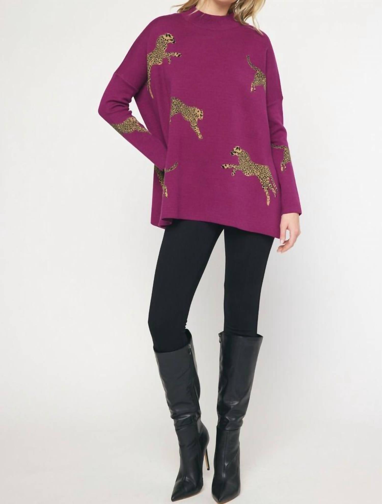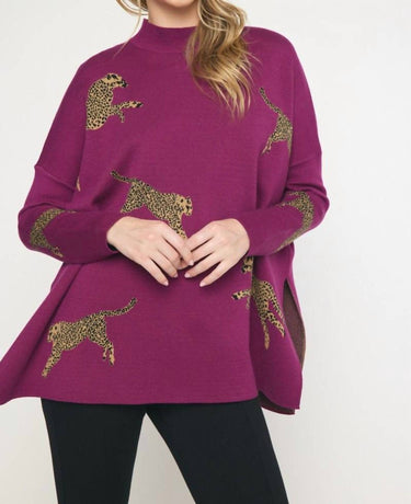 A perfect addition to any wardrobe, this classic tunic style blouse is flattering and effortless. You can easily transition from desk to dinner in this chic top. Embrace effortless style with the Leopard Poncho Tunic Sweater by Entro, a standout piece in a rich plum hue. This tunic features long sleeves and a trendy mock neck, with a bold graphic cheetah print that adds flair to your look. Designed for comfort and warmth, it offers a pull-on closure and showcases drop shoulders with side slits for ease of movement. Ideal for versatile styling, this sweater makes a bold statement while ensuring all-day comfort.