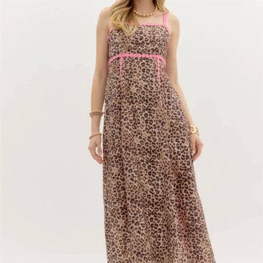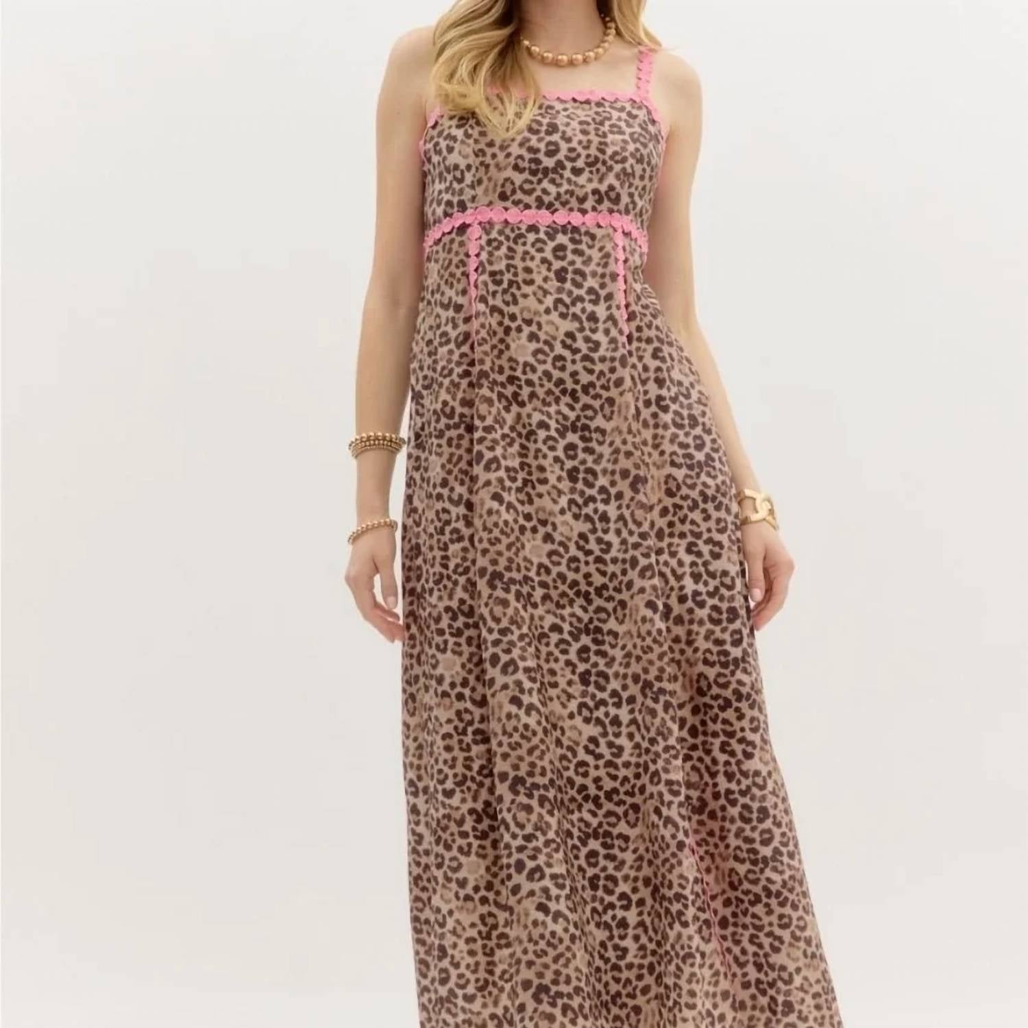 Embrace vintage flair with the Leopard Sundress With Ric Rac Trim by Entro, perfect for a summer wardrobe refresh. This brown and pink animal pattern dress features spaghetti straps and a flattering empire waist silhouette, coupled with a square neckline for a chic look. Crafted from 80% rayon and 20% nylon, it offers a comfortable pull-on closure and the convenience of side pockets. Care is a breeze with machine wash instructions, while the smocked back panel and trim-accented adjustable straps ensure a customizable fit.