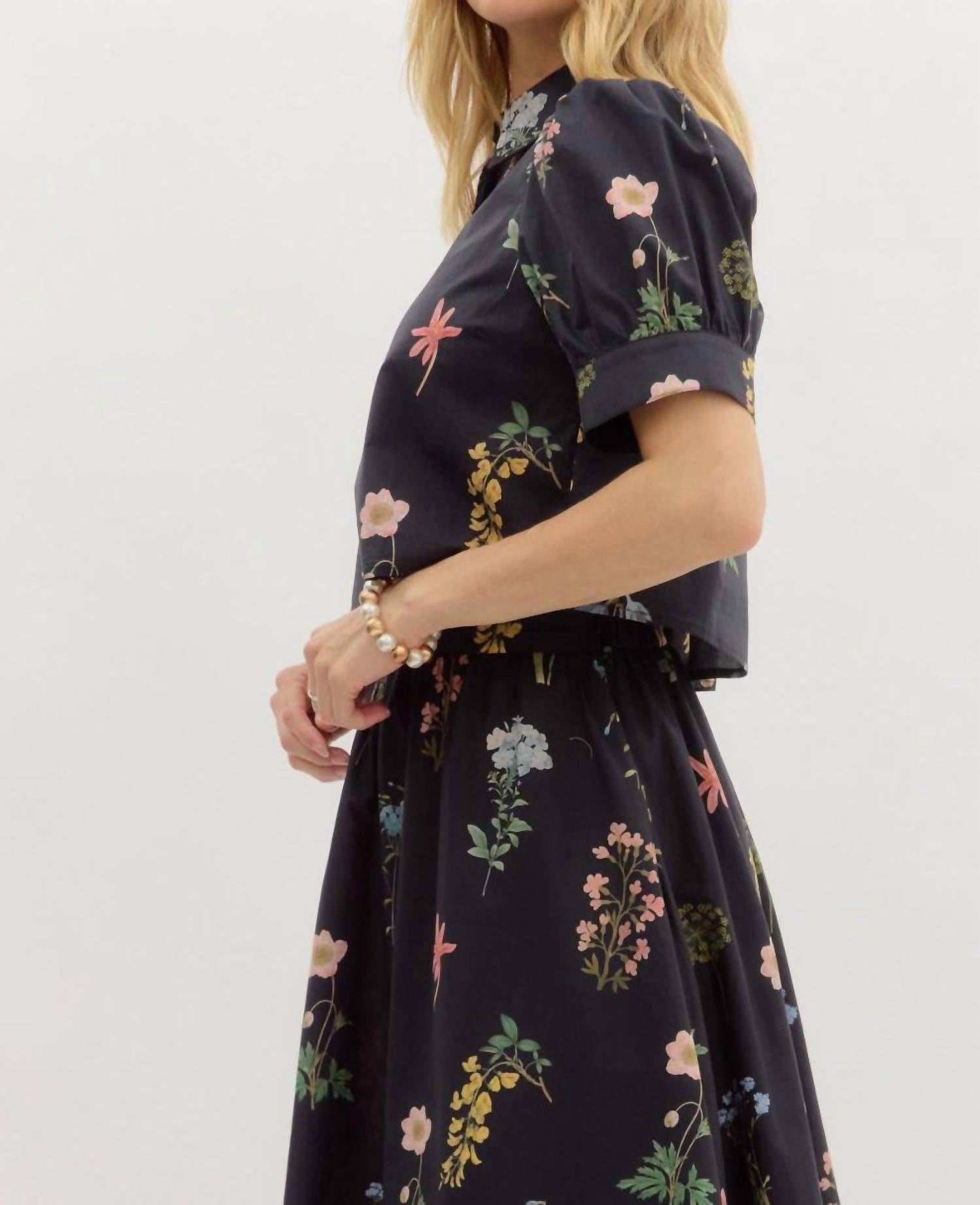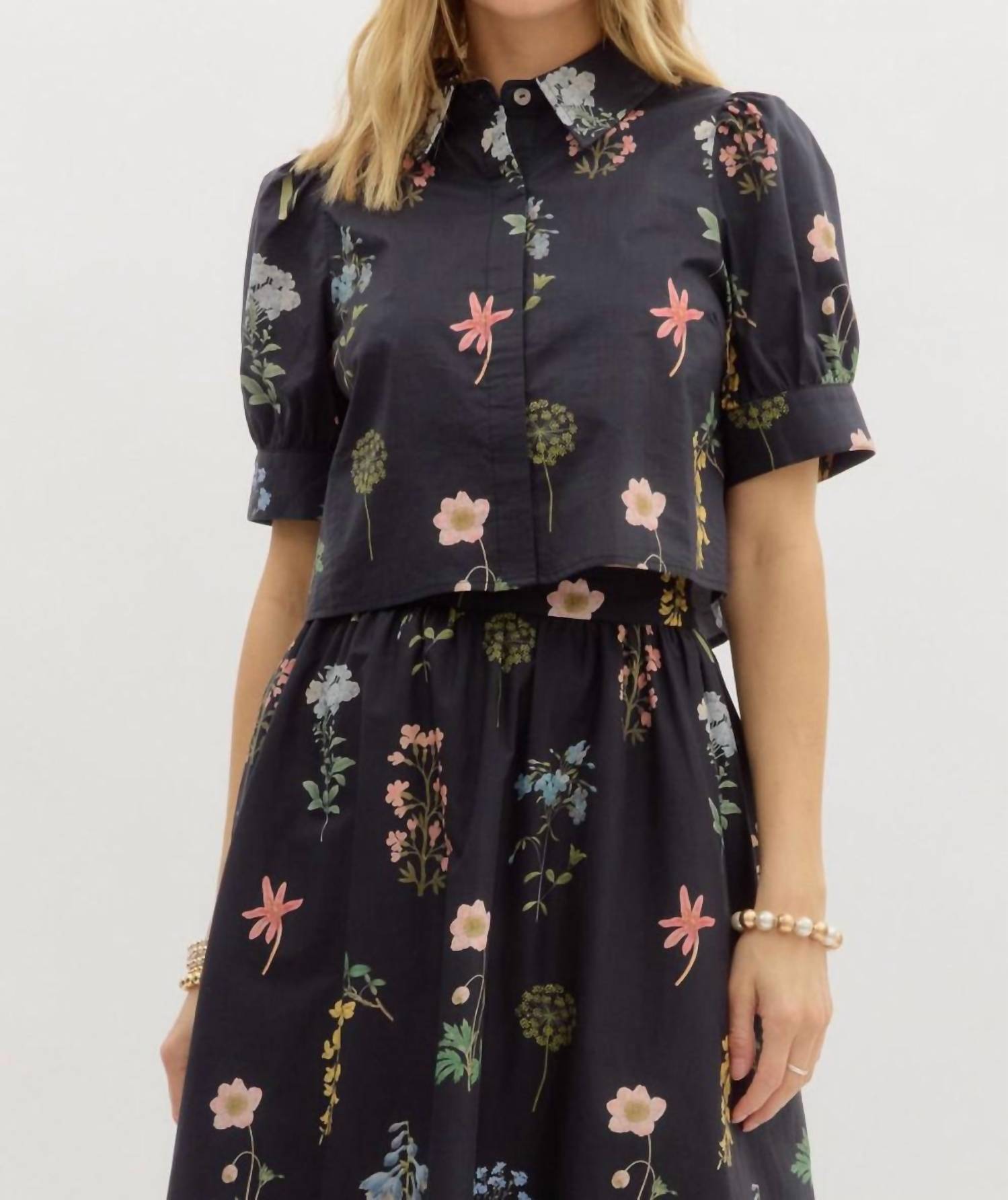 Embrace timeless elegance with the Melia Floral Print Top & Skirt Set by Entro, perfect for a chic springtime look. This set features a cropped, short puff-sleeve button-down top and a high-waist midi skirt, both adorned with an allover floral pattern on a deep black background. Made from 100% cotton, the ensemble ensures breathable comfort and is imported for assured quality. Closure is by button for the top and pull-on for the skirt, and it includes practical pockets. Hand wash cold, line dry, do not bleach, and avoid dry cleaning for best results.