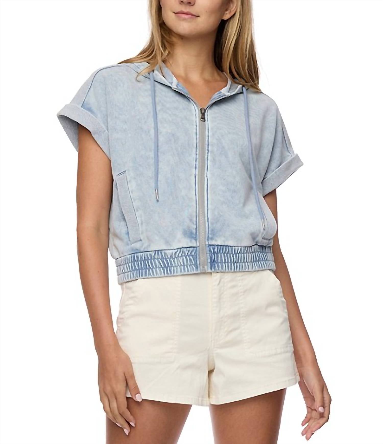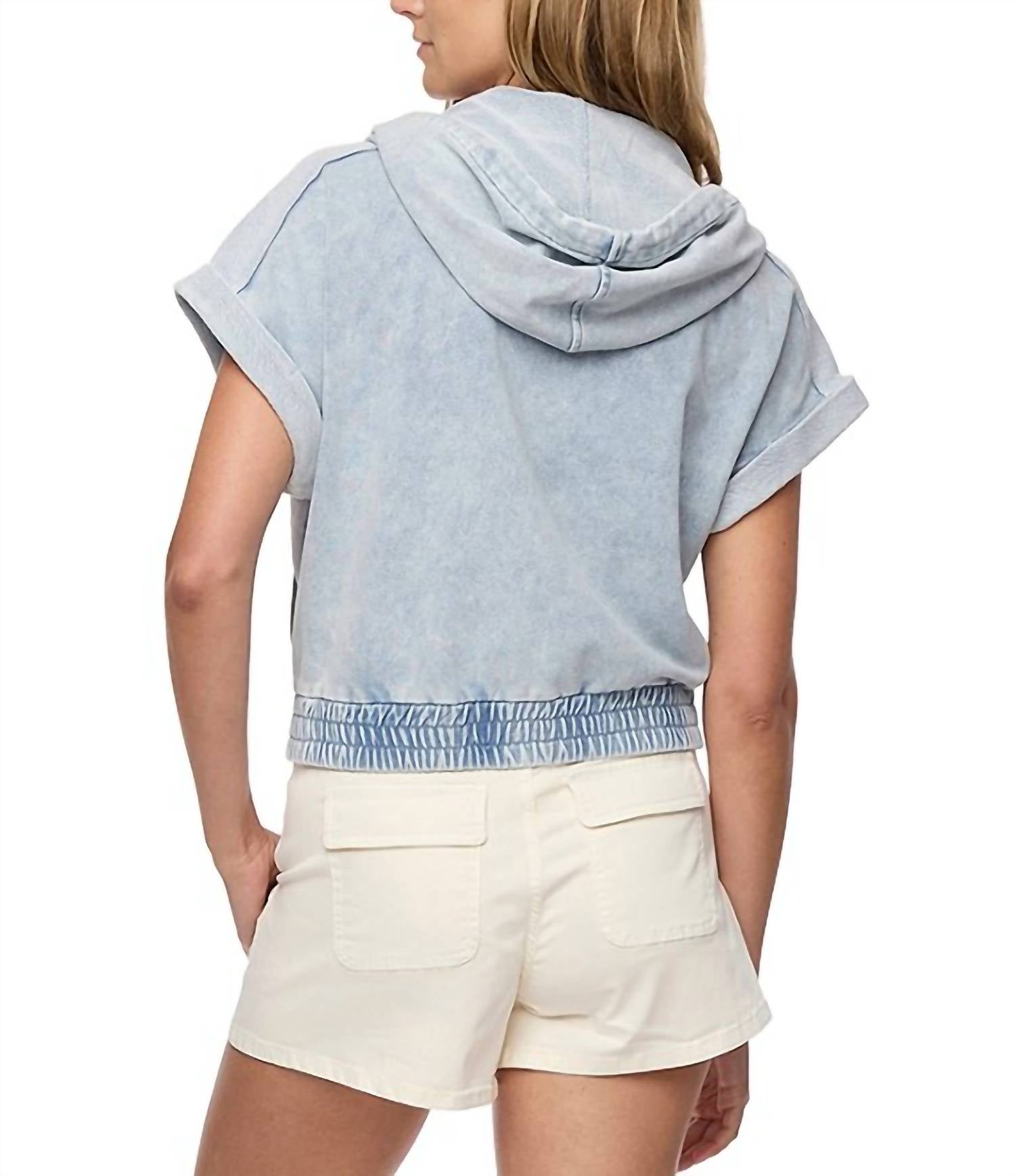Cooler temps call for layering and we love this adorable sweatshirt for all the obvious reasons. Introducing the Blaine Zip Up Hoodie by Flags & Anthem, a stylish addition to your summer streetwear collection in a soft blue plaid and check design. This hoodie features short sleeves for a relaxed, breathable fit, with practical pockets and a full zip closure for convenience. Crafted with a terry knit fabric perfect for a laid-back dinner party look, this hoodie is a nod to effortless style with a hint of elegance. Care instructions: Machine wash cold.