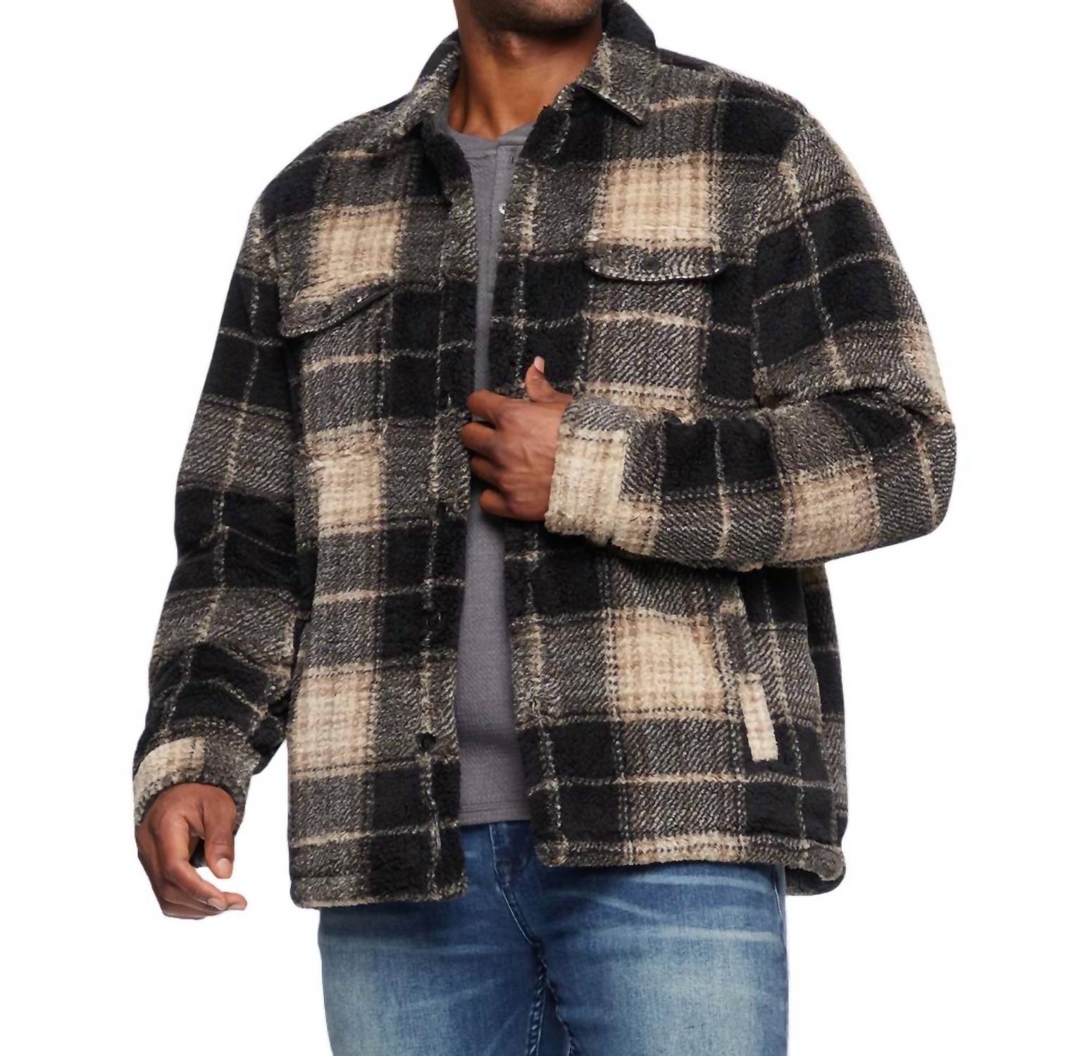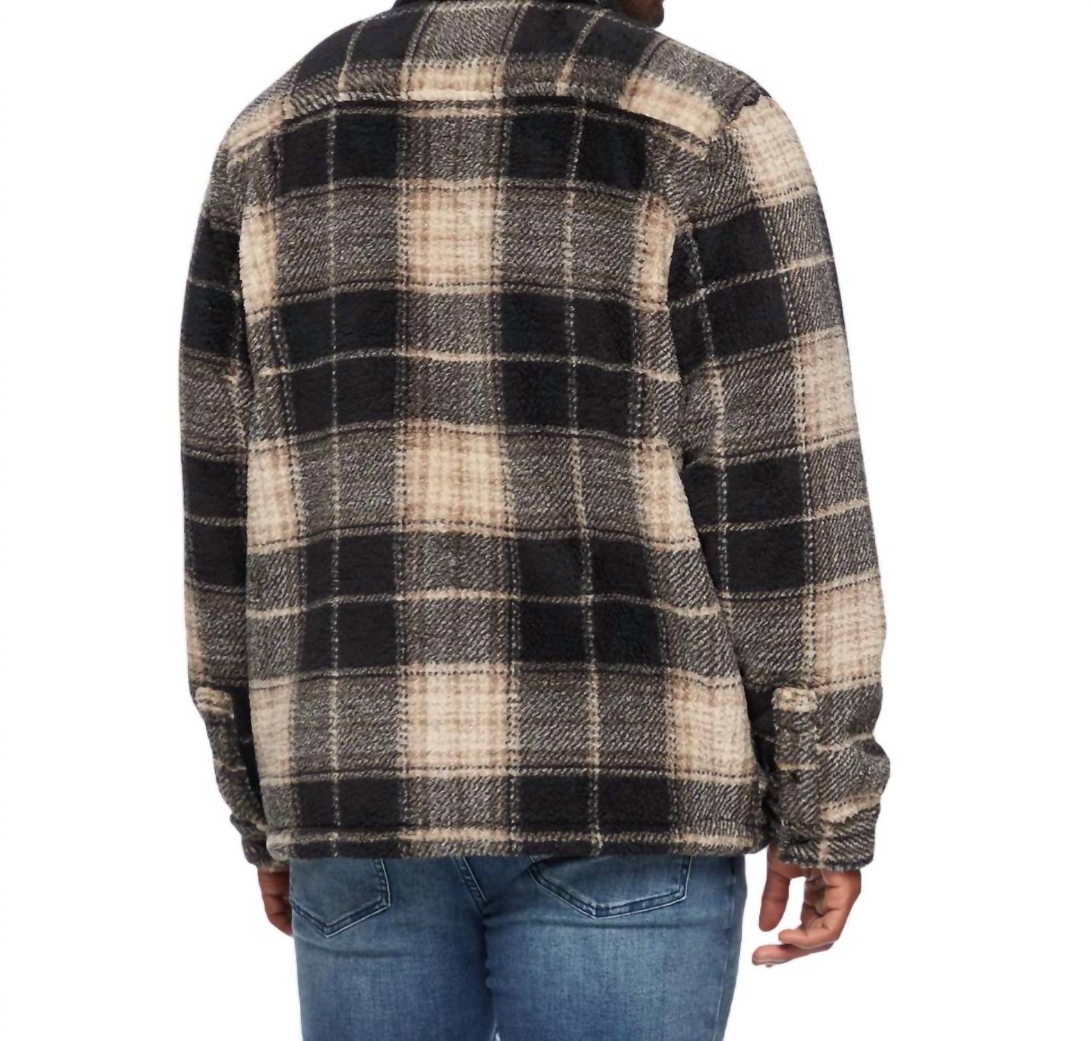 The Carter Sherpa Shirt Jacket by Flag & Anthem is an athlete's favorite, offering cozy warmth with its plush polyester sherpa fleece material. Designed for men's casual wear, it features a classic shirt collar with button closures and long sleeves in a stylish black plaid pattern. The jacket includes dual front flap pockets and angled slit pockets for securing essentials. Garment length is medium with a 29" center back length and care is simple with machine wash and tumble dry instructions. Darius is 6'3", 195 lbs, and wears a size large.