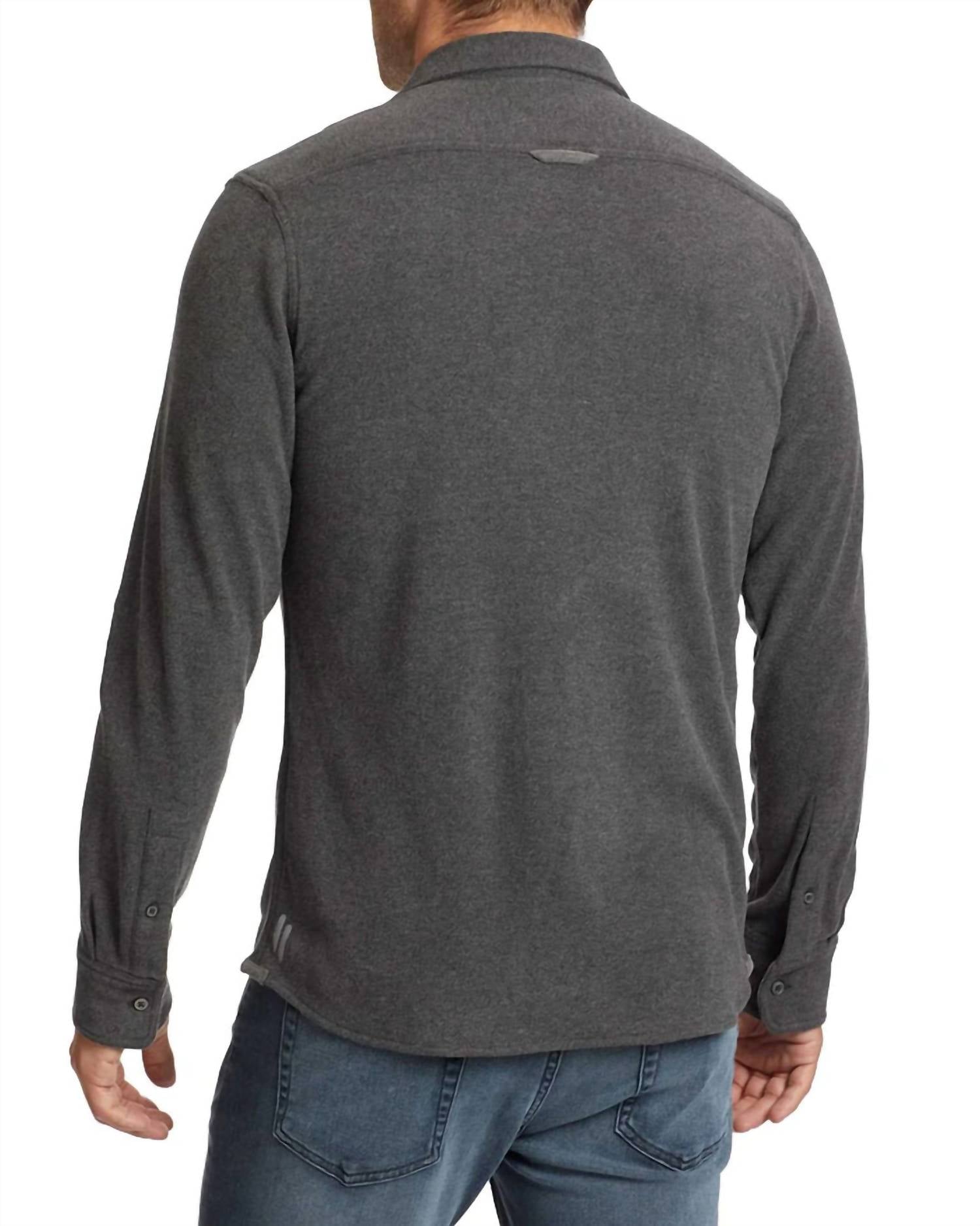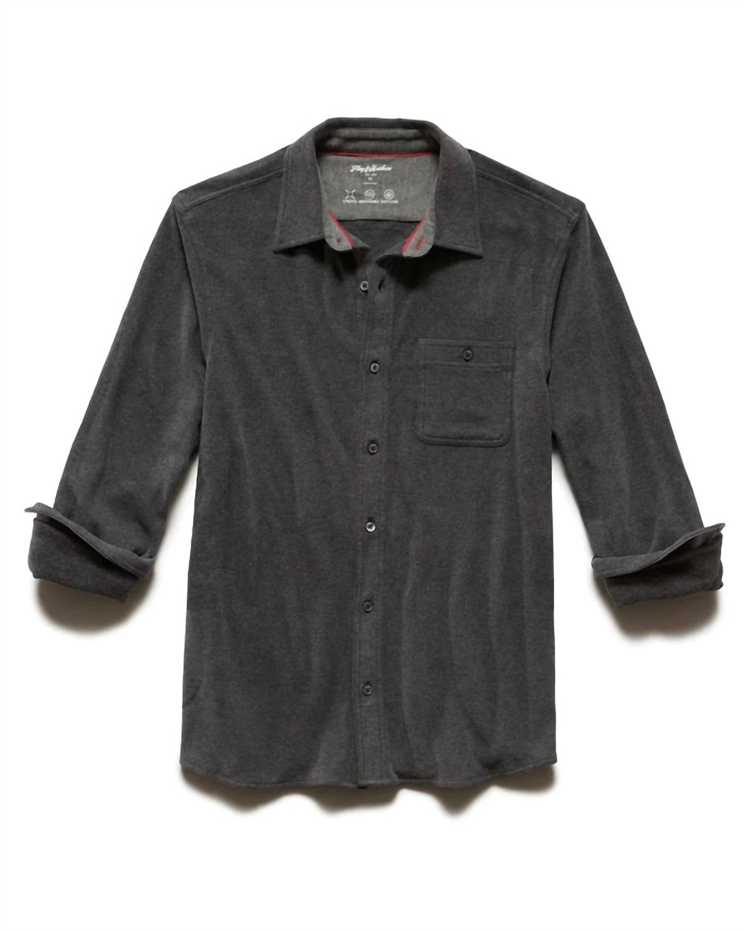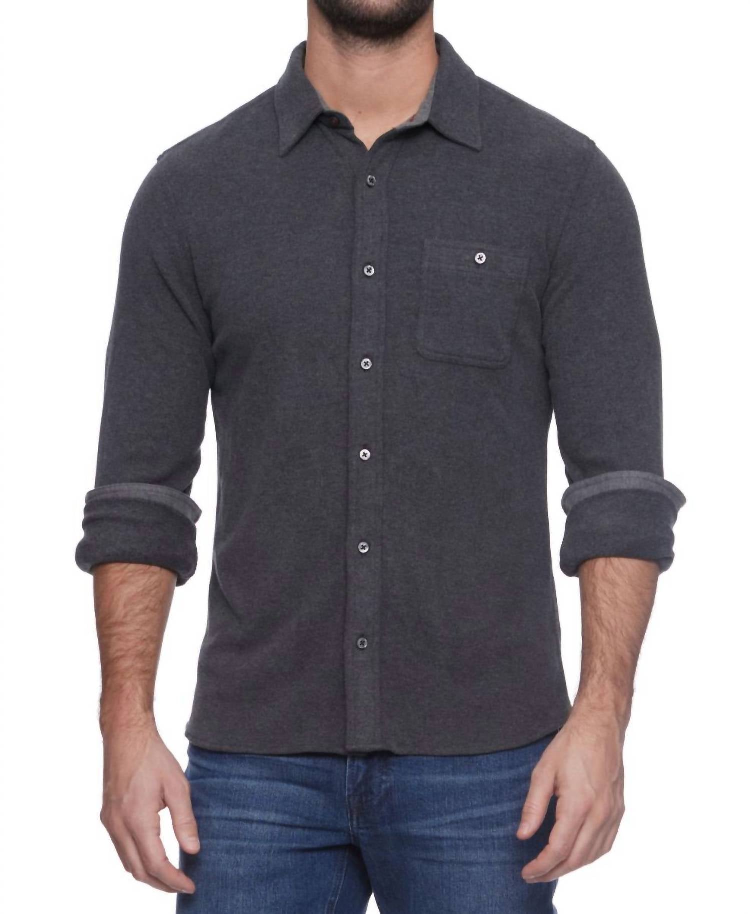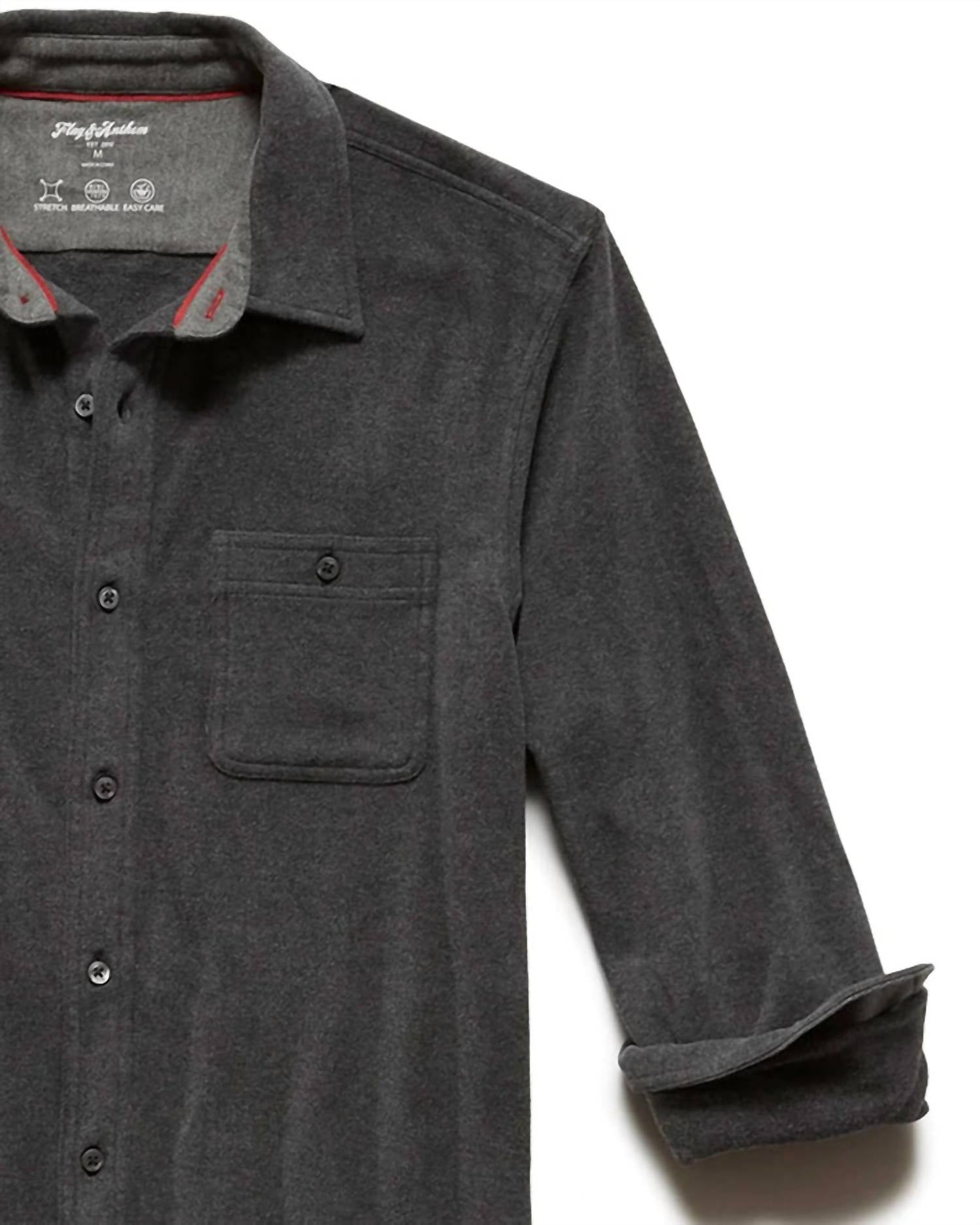 The Channing Long Sleeve Hero Knit Flannel Shirt by Flags & Anthem is a stylish and comfortable choice for a holiday party. This men's polo features long sleeves and a classic collared neckline, adding a touch of sophistication to your fall wardrobe. With a solid gray color and button closure, it effortlessly aligns with minimalist trends. Pattern: Solid. Material: Knit. Closure: Button closure. Ideal for Thanksgiving gatherings, this piece is a wardrobe staple perfect for those who value both form and function.