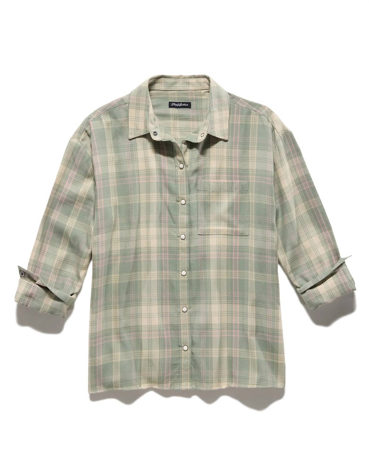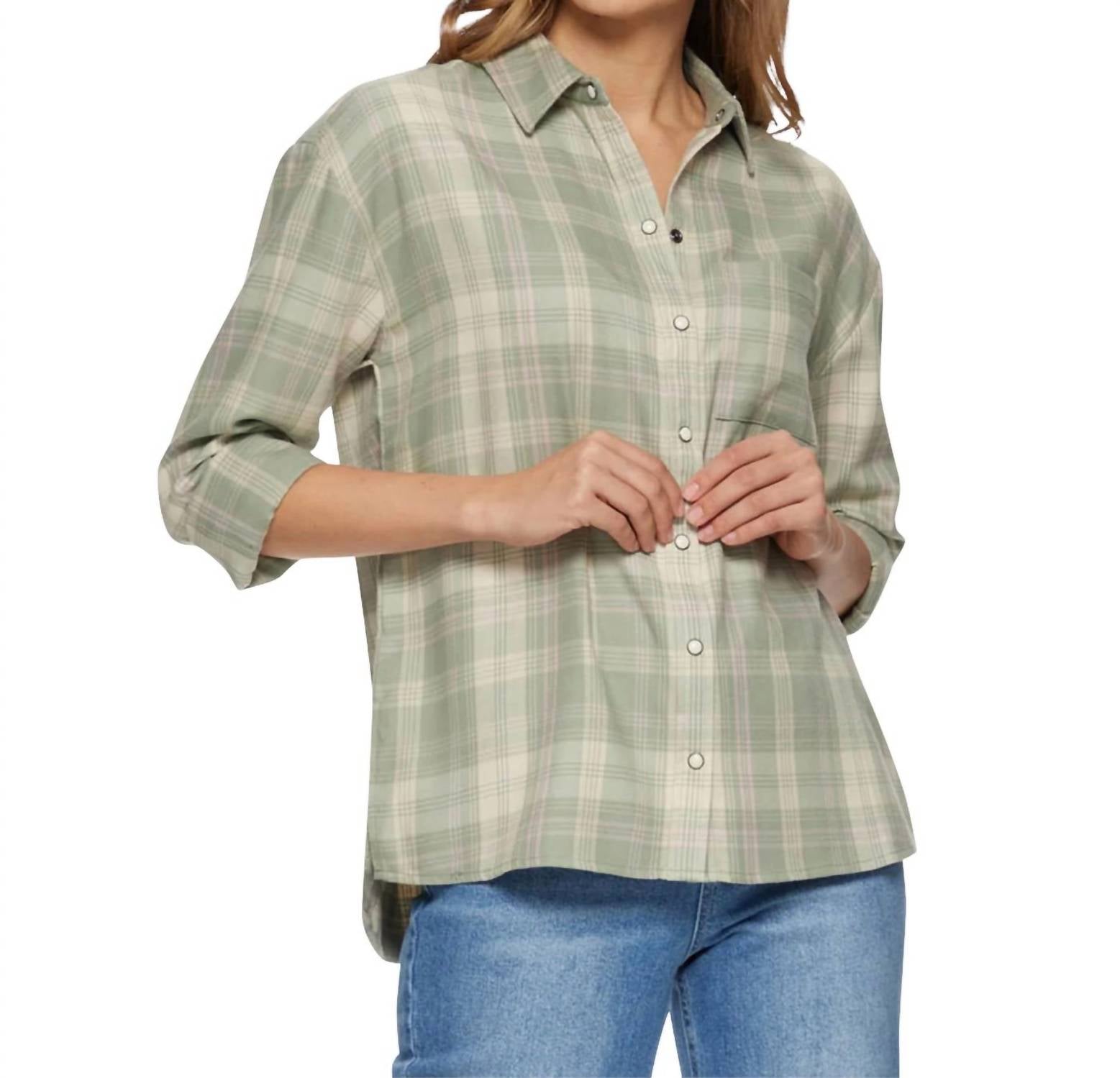 Elevate your casual ensemble with the Eric Woven Shirt by Flags & Anthem, crafted for year-round wear. Styled in a green plaid pattern, this shirt features three-quarter sleeves with button cuffs and a relaxed fit. Composition: 65% Rayon, 35% Polyester. Garment Length: 27” back body length. Closure: Button closure. Care: Machine wash; imported.