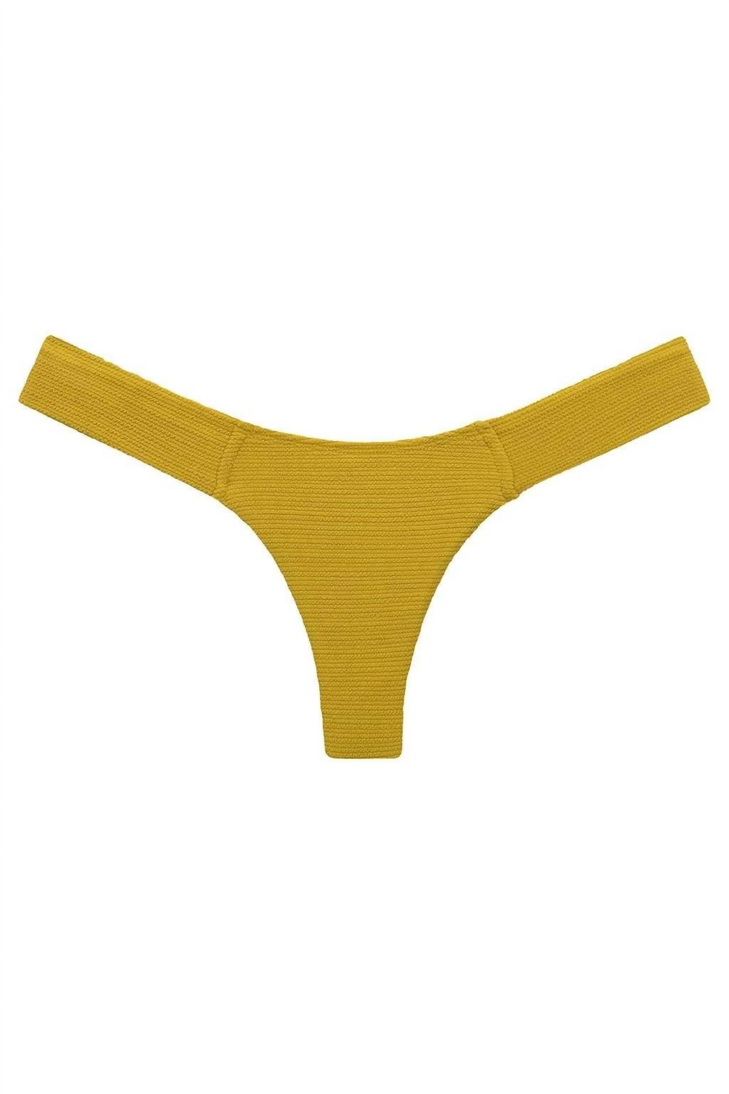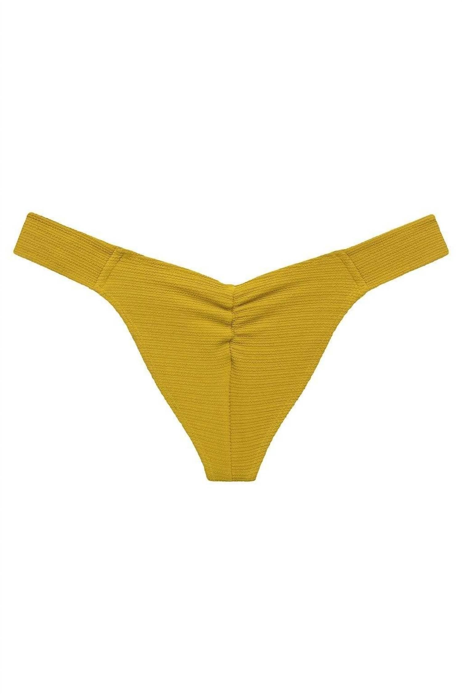 Introducing the Added Coverage Uno Bikini Bottom by Montce, a stylish swimwear piece in a chic dark chartreuse hue. Crafted from a textured micro scrunch material, this bikini bottom offers a cheeky fit with minimal coverage, featuring an additional 2 inches for more discretion and a ruched back to accentuate your curves. Made from a stretchy nylon/spandex blend imported from Italy, this piece ensures a comfortable fit perfect for beach days. Care: Hand wash.