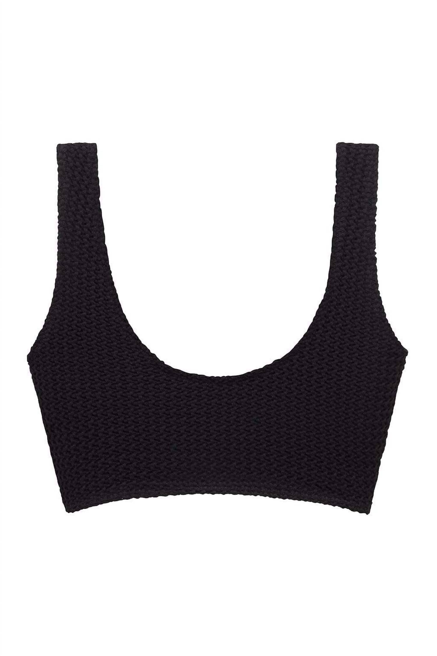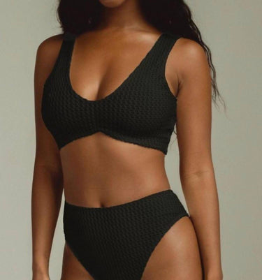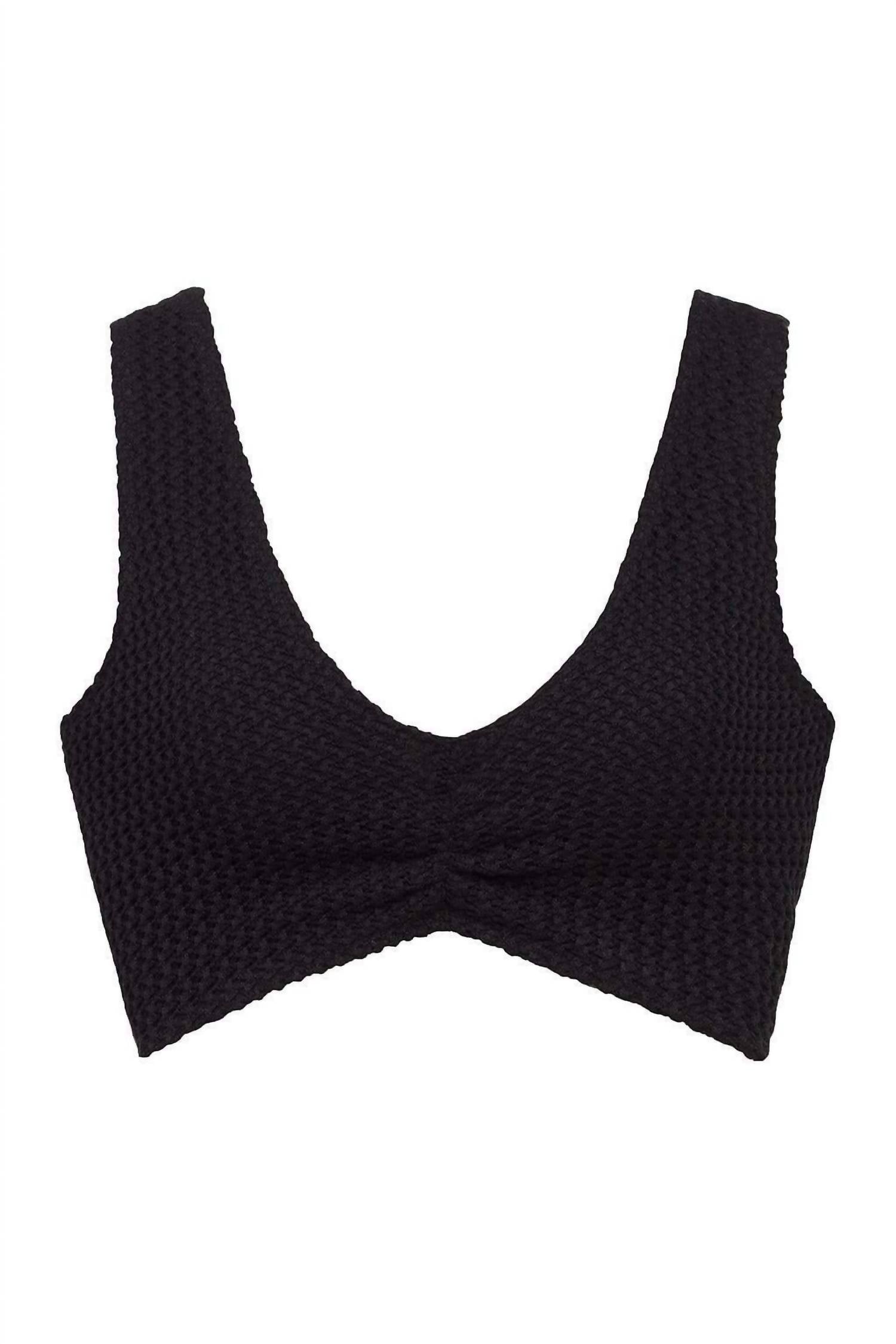 Elevate your beach day style with the Crochet Kim Variation Bikini Top by Montce, a chic swimwear piece in a solid true black. This versatile bralette features a flattering V-neckline and ruched detailing at the front, offering medium support and a subtle lift. Crafted from a nylon and spandex blend, it boasts an extra stretch knit crochet with imported fabric from France. Care for your bikini top by hand washing it, ensuring it remains a staple in your summer athleisure collection.