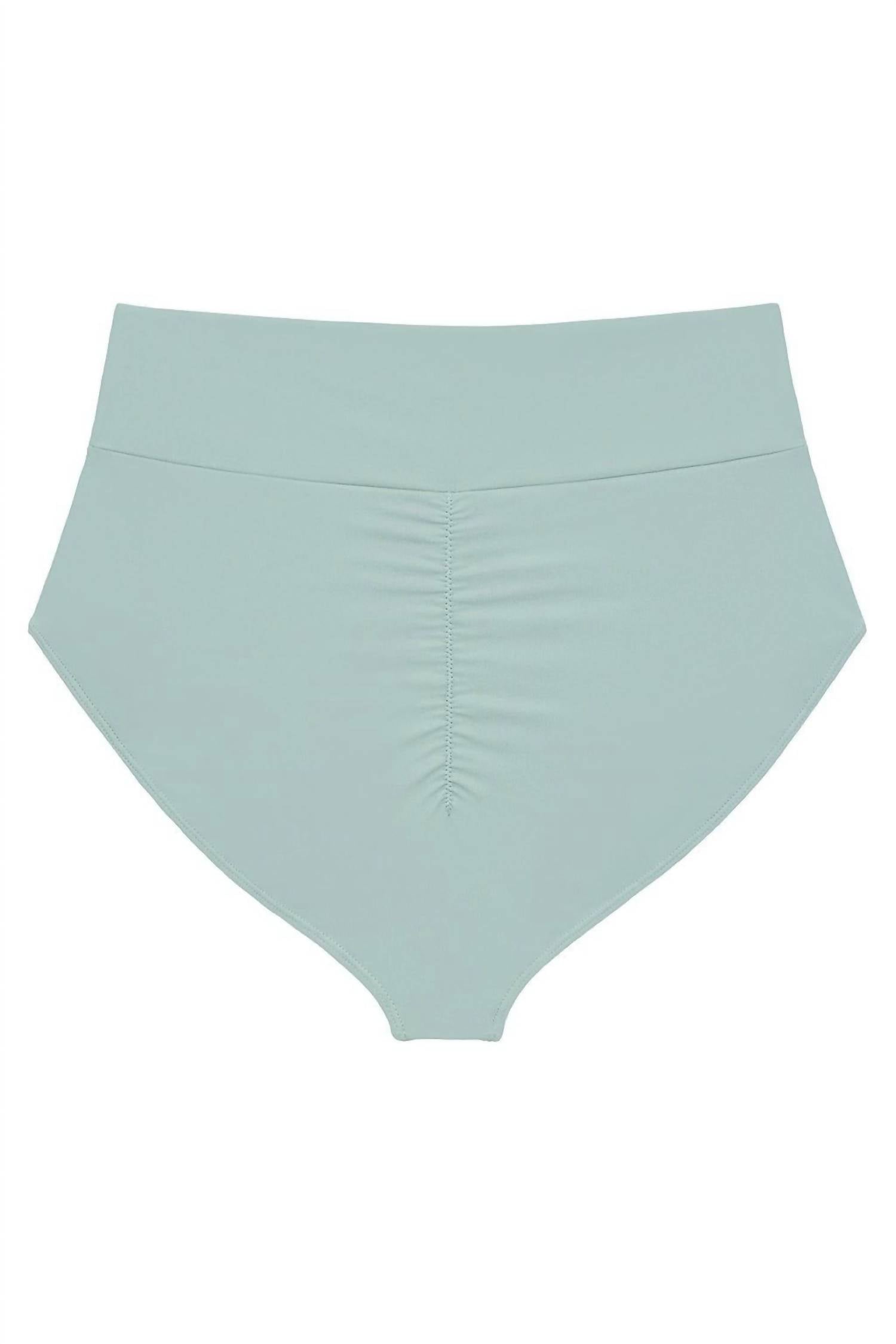 Discover the Full Coverage High Rise Bikini Bottom by Montce, designed for modern beach appeal in powder blue. This swim essential is crafted from an 80% Nylon, 20% Spandex blend, providing a buttery soft feel. The high-waisted design features a contouring waistband and ruched back for an accentuated silhouette, offering full front and back coverage. Care instructions include hand washing and line drying to maintain its OEKO-TEX certified quality.