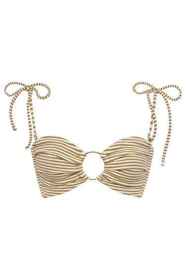 Elevate your swimwear collection with the Tori Ties Bandeau Bikini Top by Montce, featuring a classic bandeau silhouette adorned with a flattering sweetheart neckline and ruched detailing. Crafted from a durable 90% nylon and 10% spandex blend, this top offers medium support with side seam boning and adjustable self-tie closures for the perfect fit. The tan and beige stripe pattern and gold tarnish-resistant metal hardware add a touch of elegance, while the removable tie straps offer style versatility. Made with premium OEKO-TEX certified fabric from Spain, it requires hand washing and line drying to maintain its quality.