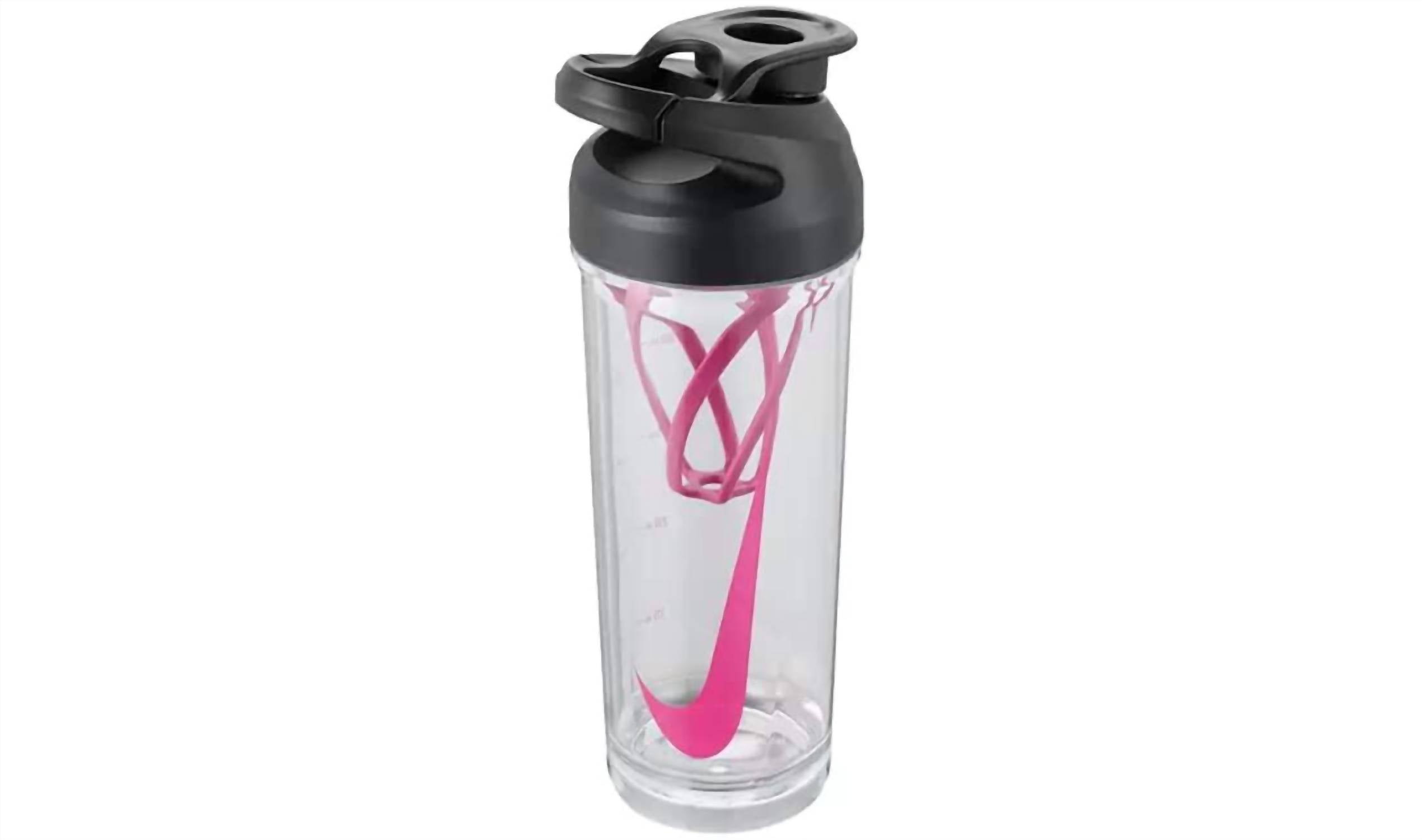 Meet the Hypercharge 24 Oz Shaker Bottle by NIKE, an essential for any fitness enthusiast. This 946 ml bottle is crafted from 73% Tritan, 26% Polypropylene, and 1% Silicone, ensuring durability and safety, being BPA-free and odor-resistant. Its integrated blender efficiently mixes protein powders and supplements, while the hinged closure ensures leak prevention. The rounded interior simplifies cleaning, and it's dishwasher safe for added convenience.