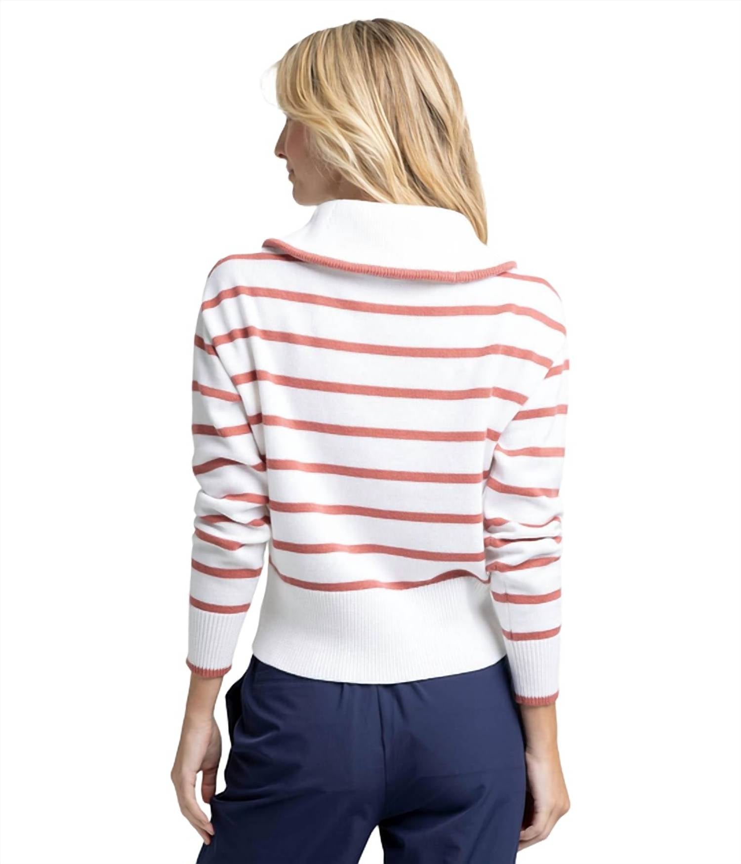 Indulge in the comfort of the Maizy Quarter Zip Sweater by Southern Tide, a chic addition to your wardrobe with its long sleeves and striped pattern. Crafted from soft and sustainable 100% cotton, this piece offers a flattering fit with its chunky ribbed waist and wristbands. The sweater features a mockneck and a convenient zip closure, adding a touch of preppy style perfect for spring vacations. Care for this Dusty Coral essential is effortless with machine wash and flat dry instructions.