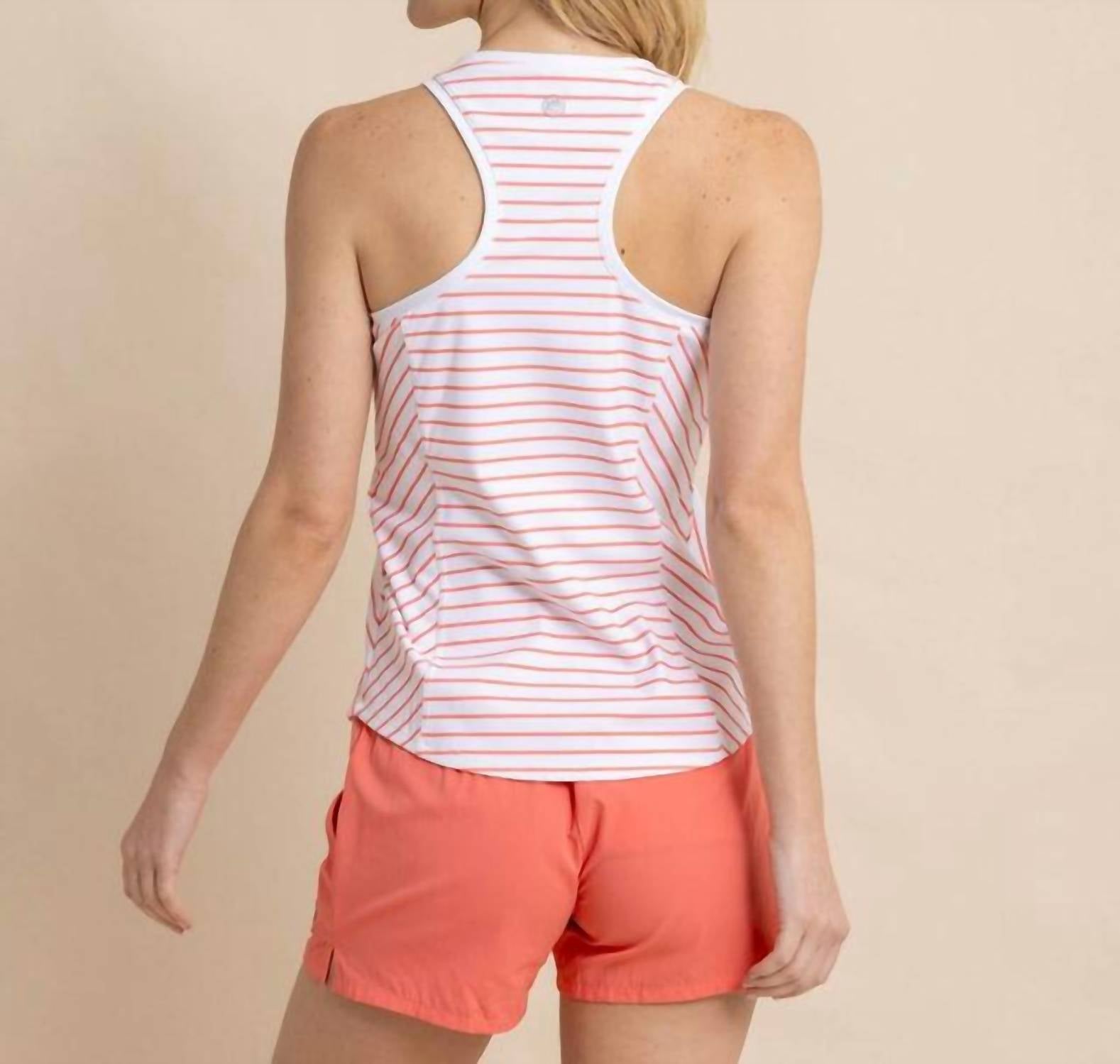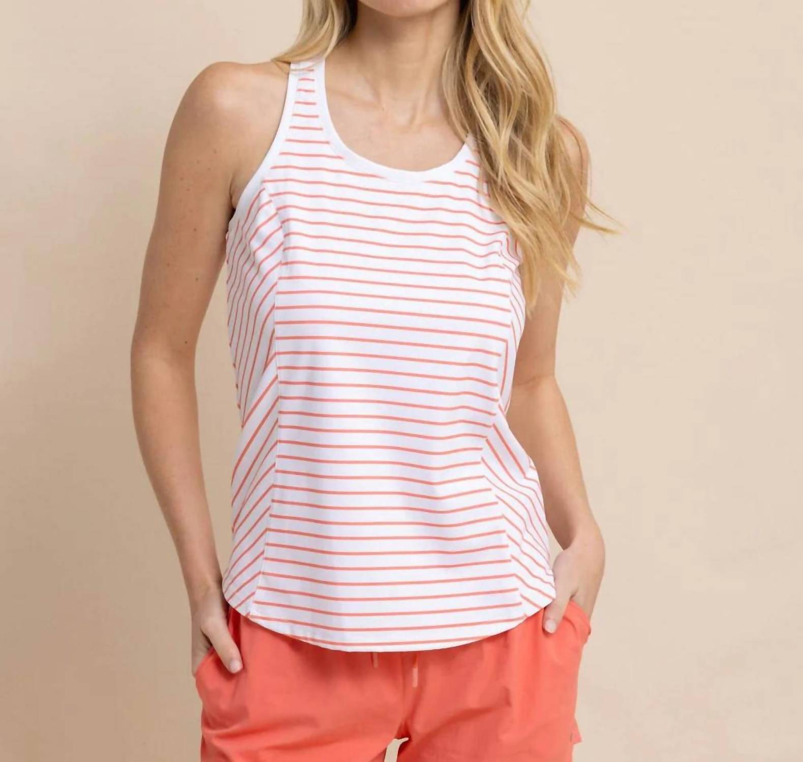 The Myra Stripe Racerback Tank Top by SOUTHERN TIDE is your go-to choice for active style. This sleeveless tank features a flexible 75% Nylon and 25% Spandex composition, offering optimal comfort and breathability. Designed in a classic white with stylish chevron stripe side panels, it has a scoopneck and convenient pull-on closure. Ideal for summer workouts, it is easy to maintain with machine washing and tumble drying.