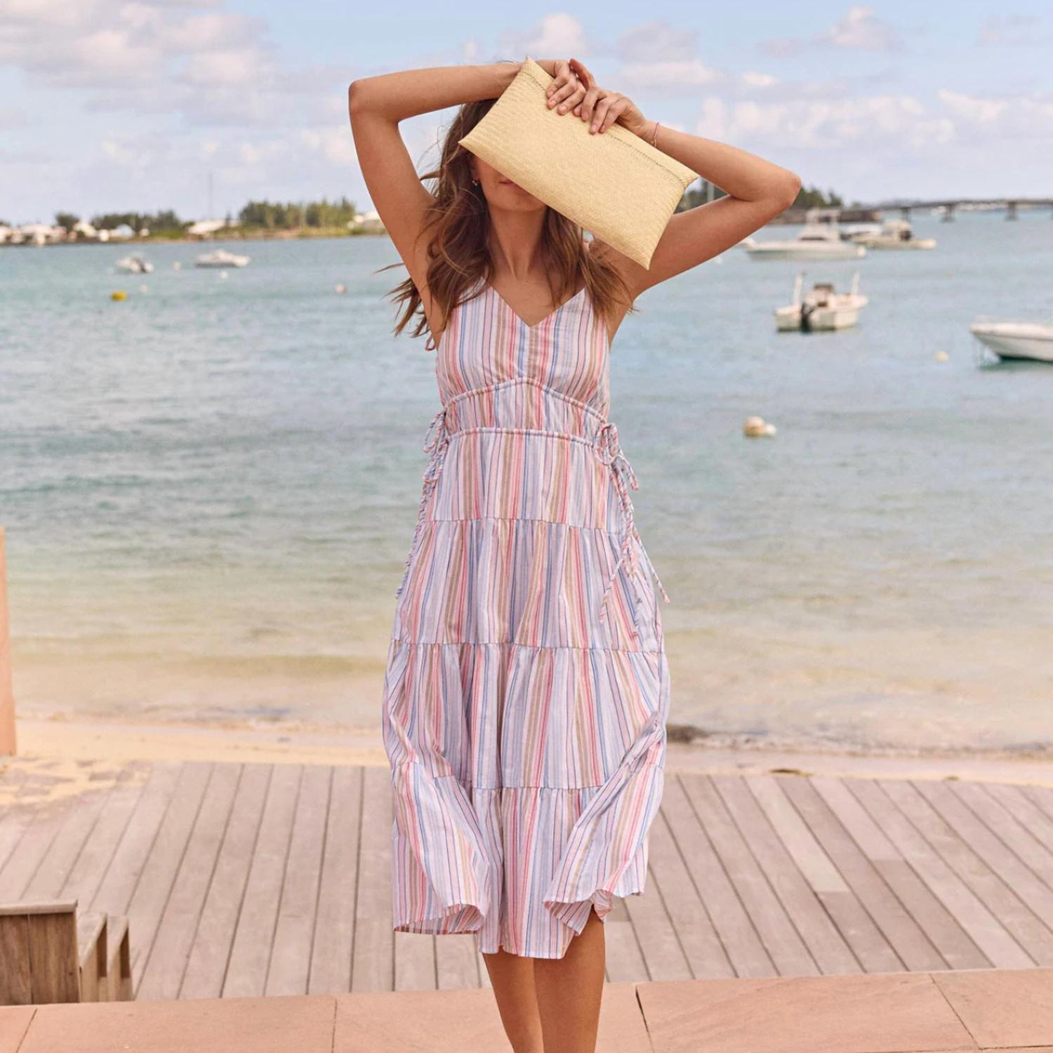 Elevate your seasonal wardrobe with the Raquel Dress by Southern Tide, a stunning midi dress in vibrant Boat Blue. Designed with spaghetti straps and adjustable tie accents, this 48" A-line silhouette ensures a flattering fit for any spring party or summer soirée. Crafted from premium 100% Cotton Lawn, it features a subtle V-neck and convenient on-seam pockets, bringing both style and functionality. Care instructions include machine wash warm with like colors on a gentle cycle and tumble dry low.