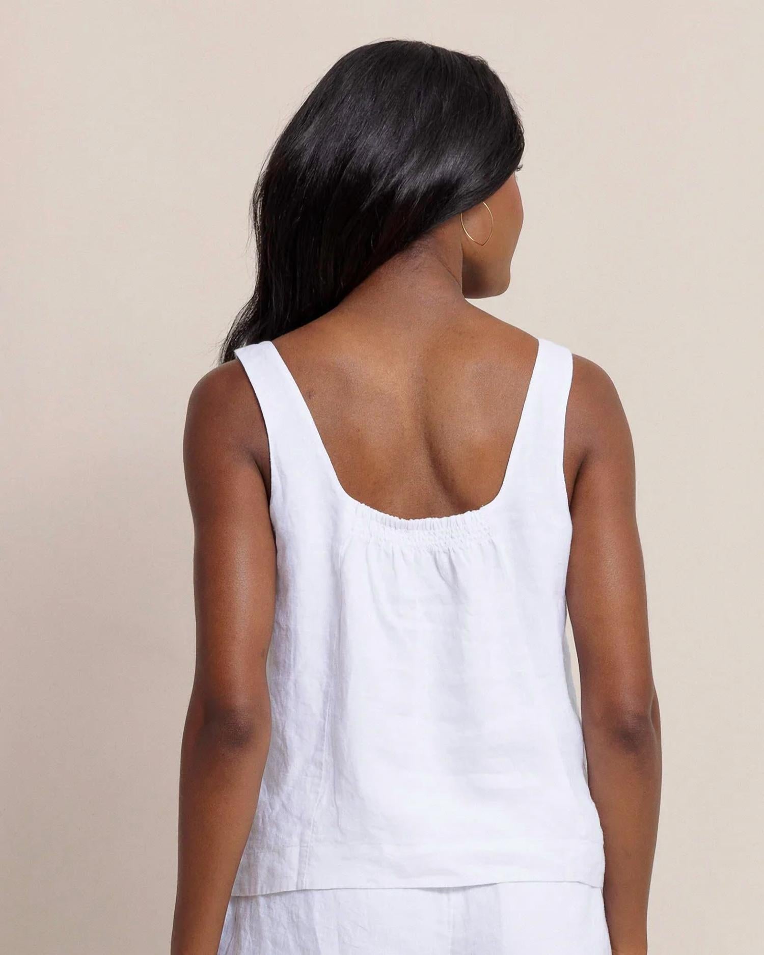 Elevate your wardrobe with the Verity Linen Square Neck Tank by Southern Tide, a must-have for minimalist summer fashion. This sleeveless tank, crafted from 100% linen, features a flattering square neckline and convenient pull-on closure. Fully lined with smocking at the back and bust darts for structure, it's perfect for adding a touch of elegance to any outfit. Care instructions: Machine wash and tumble dry for easy maintenance.
