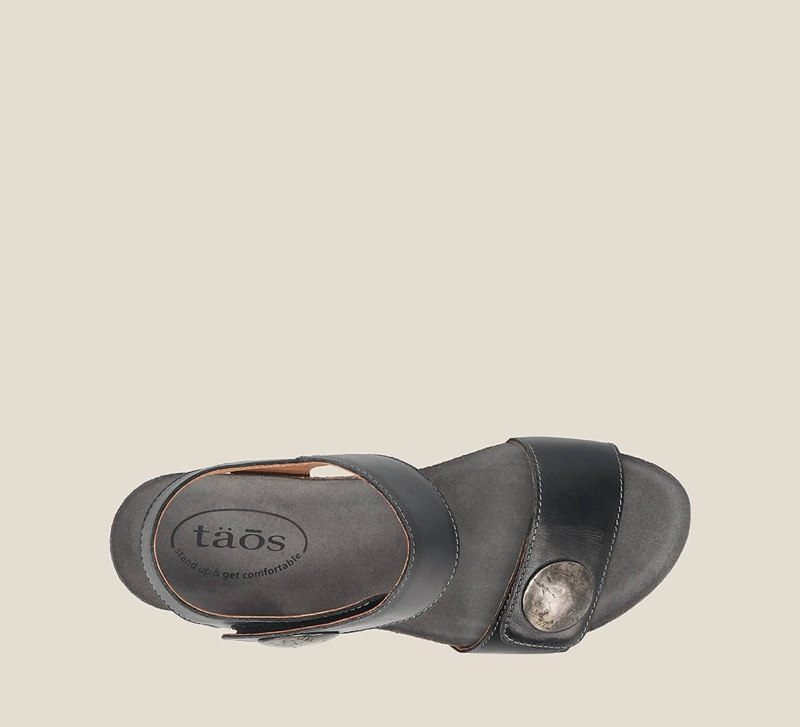 Elevate your style with the Women's Carousel 3 Leather Wedge Sandal by Taos, the perfect addition for your summer wardrobe. Crafted from full grain leather, this black sandal features a convenient hook and loop closure and a comfortable suede-lined flexible, padded contour footbed. Boasting arch and metatarsal support, it provides unparalleled comfort with a 2.5" wedge heel. Care for your sandals by applying waxed leather cream to maintain their elegant look.