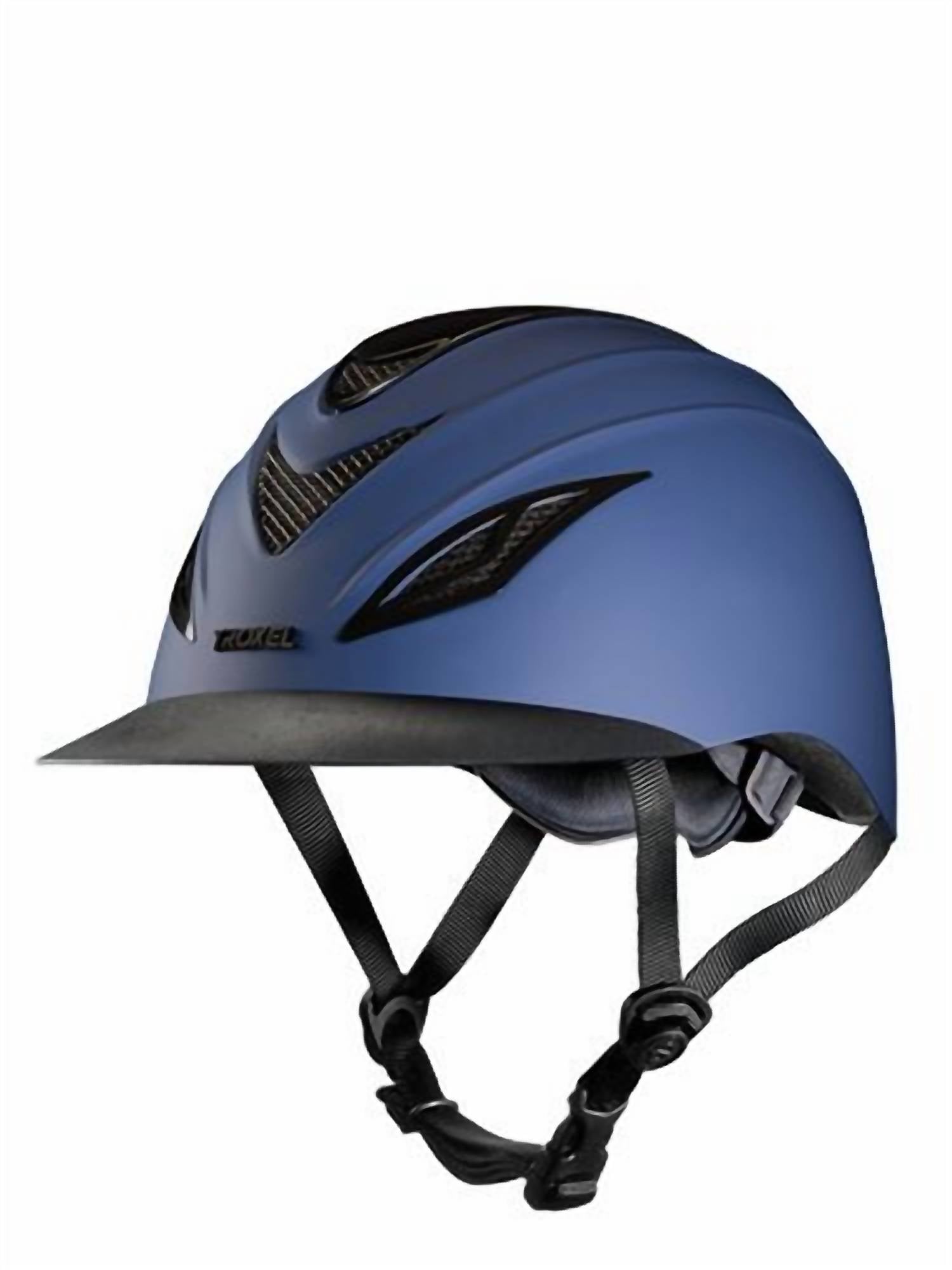 Introducing the Women's Avalon Riding Helmet by Troxel, crafted in a sleek Navy with a modern low profile design. Made with durable nylon, it features bold steel vent covers for ultra-ventilation and a matte Duratec™ finish. The helmet boasts an Extended Coverage FlexVisor™, SureFit™ Elite fit system, and a FlipFold™ removable washable headliner with Air-Channel™ technology. ASTM/SEI-certified, this helmet promises safety and innovative technology in one stylish package.