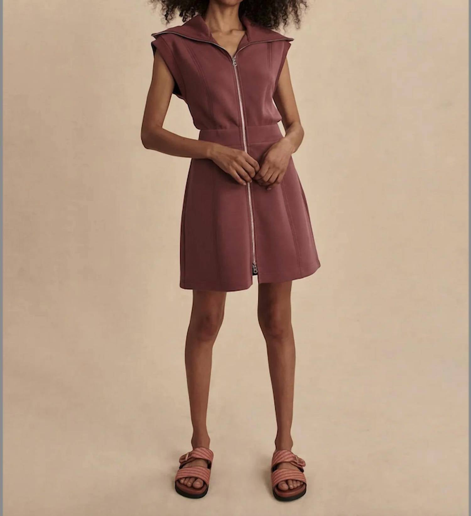 Experience effortless summer style with the Rebecca Zip-through Dress by VARLEY, crafted in a vibrant wild rhubarb hue. This dress features cap sleeves and an A-line silhouette with an exaggerated rib collar for a chic minimalist look. Composition: 81% Viscose, 15% Polyester, 4% Elastane. Closure: Zip closure with functional side-entry pockets. Care: Machine wash cool inside out and line dry.