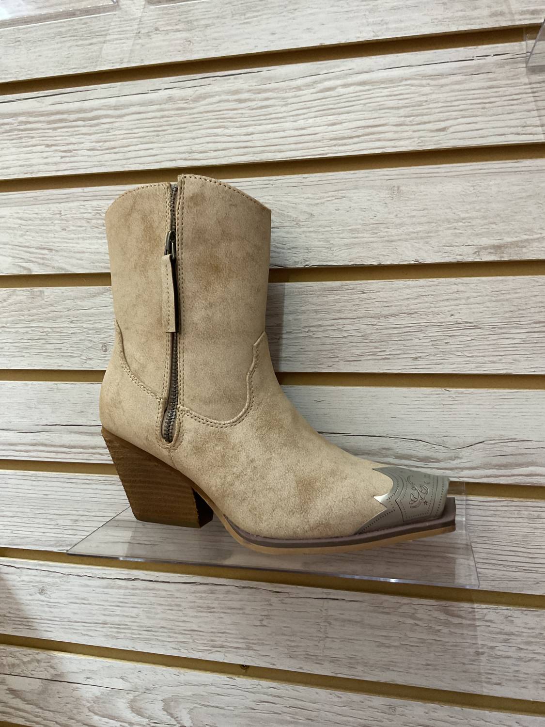Jimi Nude Booties are western-style shoes with a 3-inch heel and a square toe. They are 9.5 inches tall and have inside and outside zippers for easy wear. The booties feature a metal snip toe detail for added style.