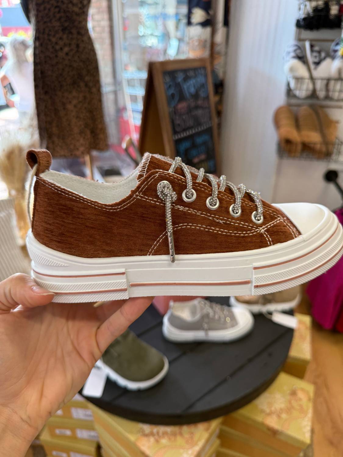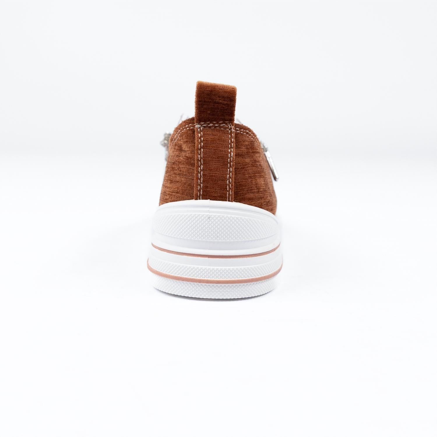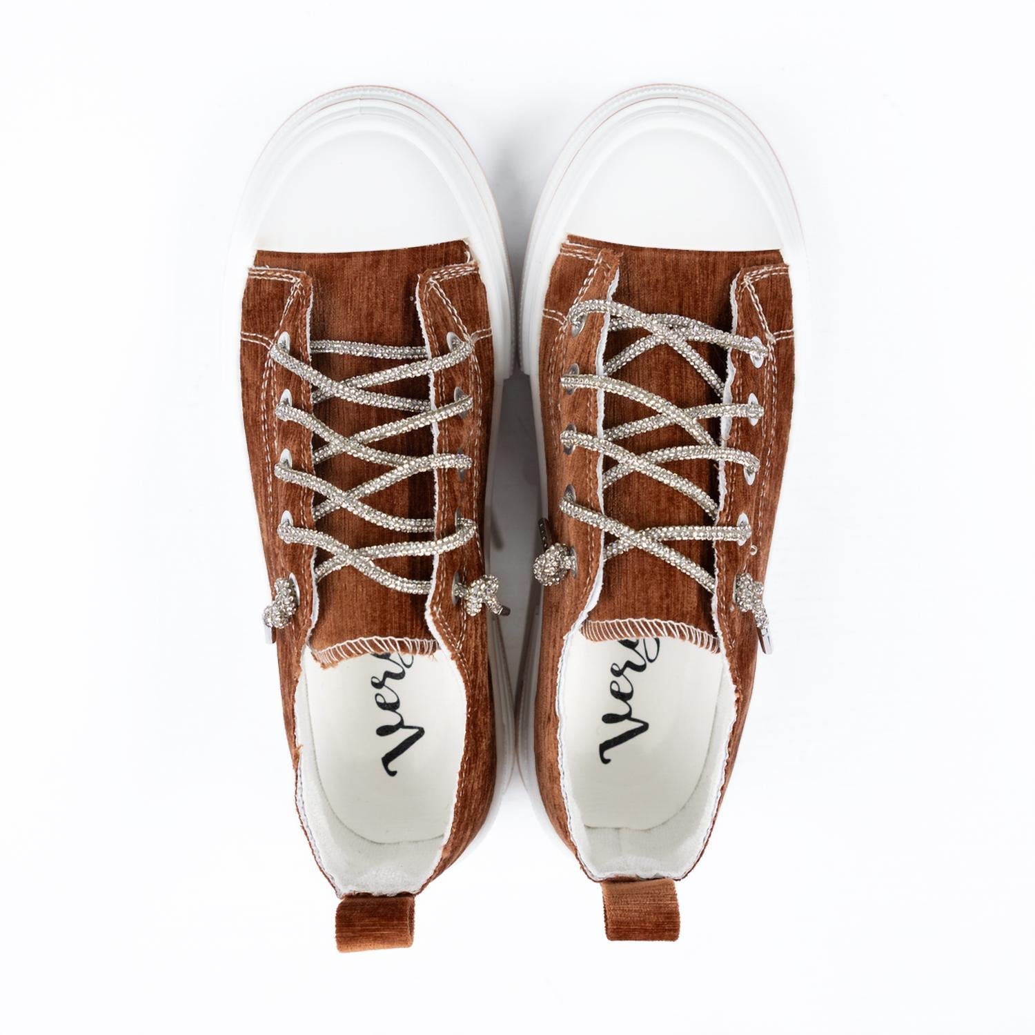 Elevate your footwear collection with the Women's Aman Rhinestone Lace Up Sneaker by Very G, a stylish choice for any fashion-forward woman. Made from copper brown velour, these sneakers feature eye-catching silver sparkle rhinestone laces that complement the glitter lace-up closure, adding a touch of glamour to any look. With a foam footbed and a 3/4" flat heel sole, comfort meets style in this medium-width sneaker, perfect for parties or casual outings. Ideal for spring and Thanksgiving, this sneaker reflects the latest streetwear trend and maintains a true-to-size fit.