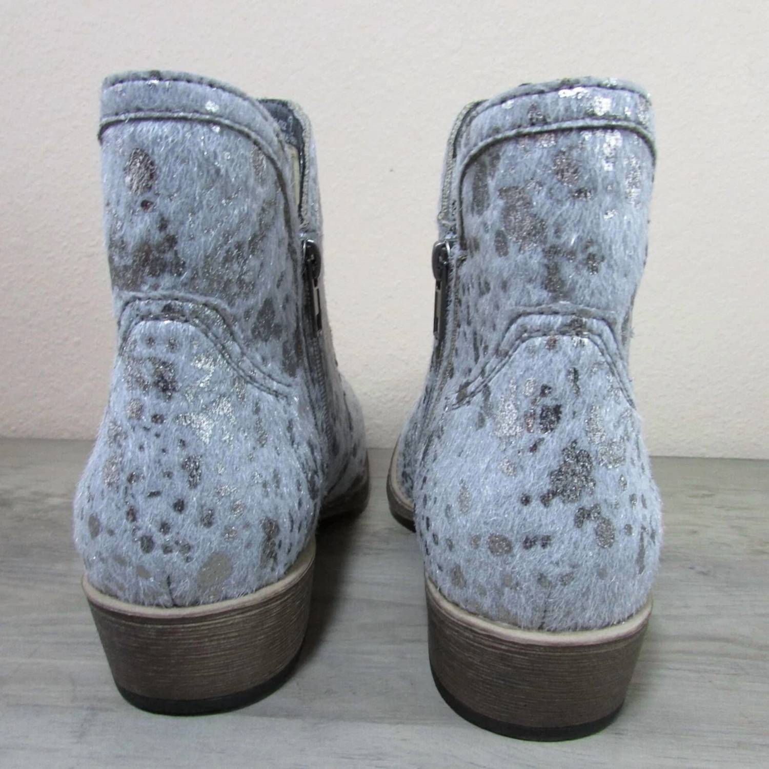 Meet the Women's Zayla Bootie by Very G, a stylish choice for any wardrobe with its chic grey hue and standout gold metallic accents. These ankle boots feature a round toe and a comfortable 1.5" block heel, combining fashion with functionality. They are crafted with a synthetic insole, rubber outsole, and genuine hair on hide uppers, providing durability and luxe appeal. With convenient zipper closures on each side, these imported boots ensure easy wear, offering a perfect blend of style and comfort for any occasion.