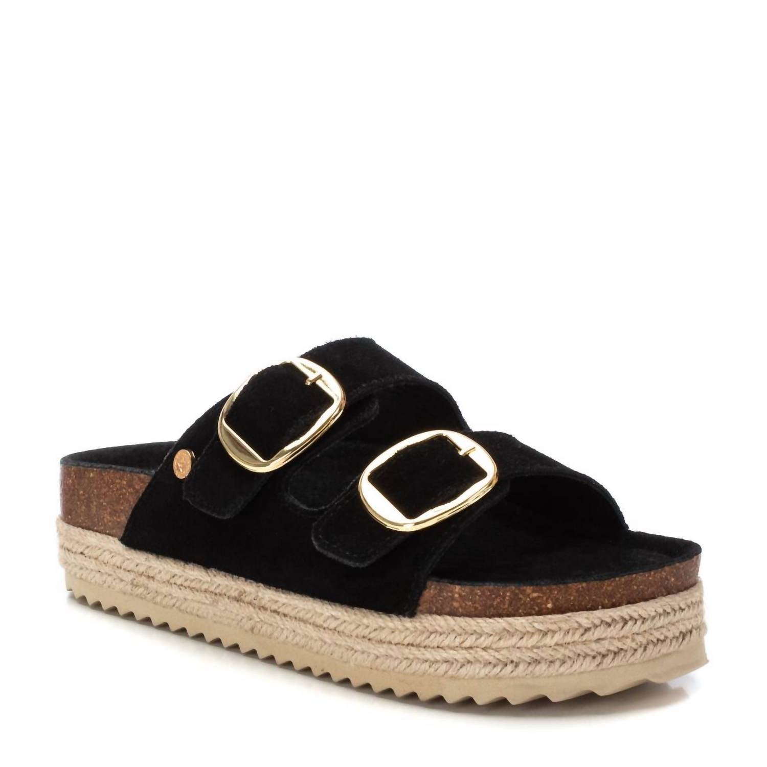 This sandal will take you from brunch to dinner and everything in between. Step out in style with the Xti Women's Casual Sandals, crafted from chic black split leather for a contemporary look. Designed with functional buckles to ensure a snug fit, these sandals boast a comfortable bios sole perfect for long summer days, complemented by a non-slip rubber sole for added stability. The flat heel design ensures ease of movement and a relaxed feel, making them ideal for both work and social outings. Toe Shape: Round Toe. Heel Height: Flat (1" & Under).