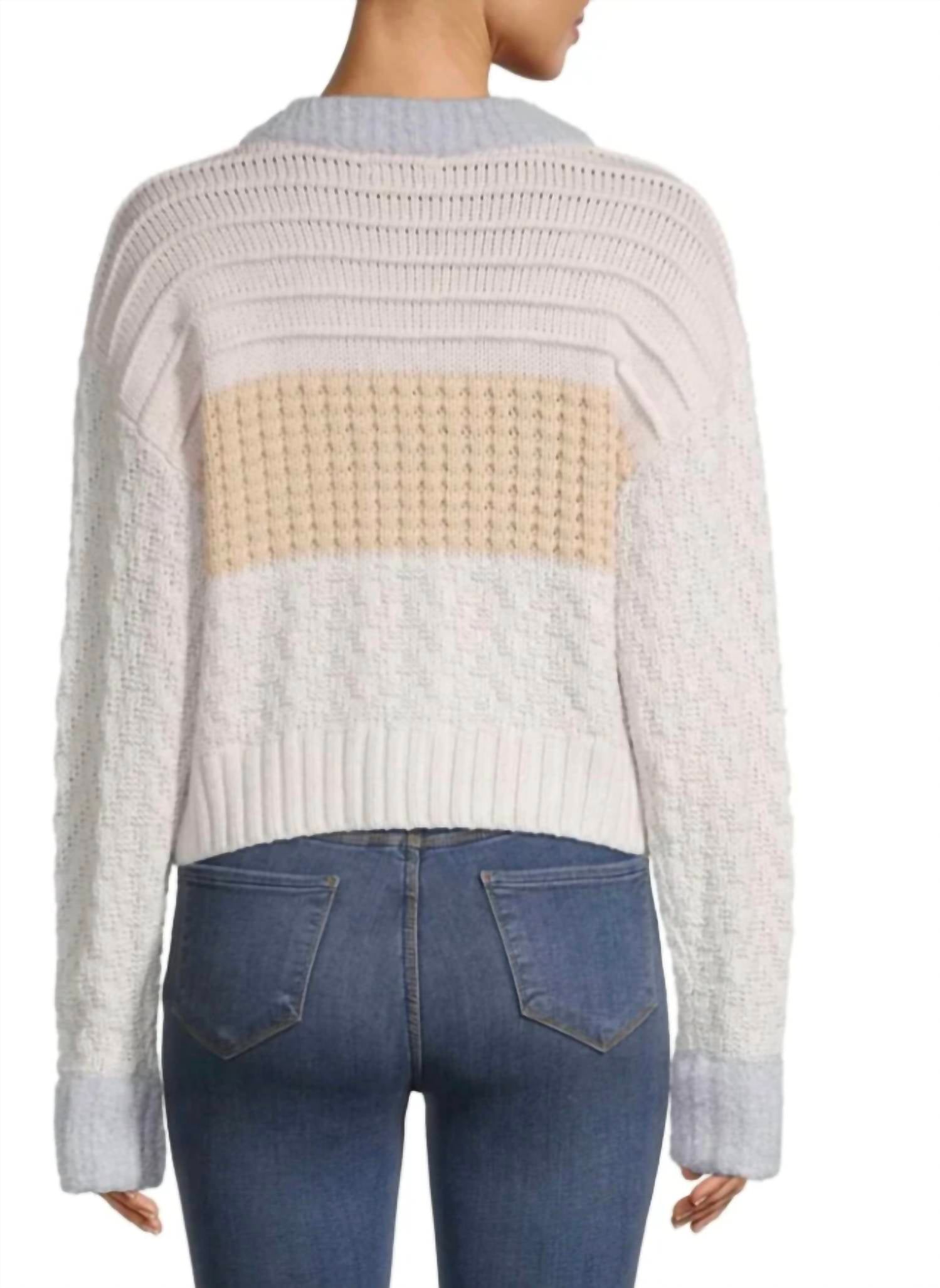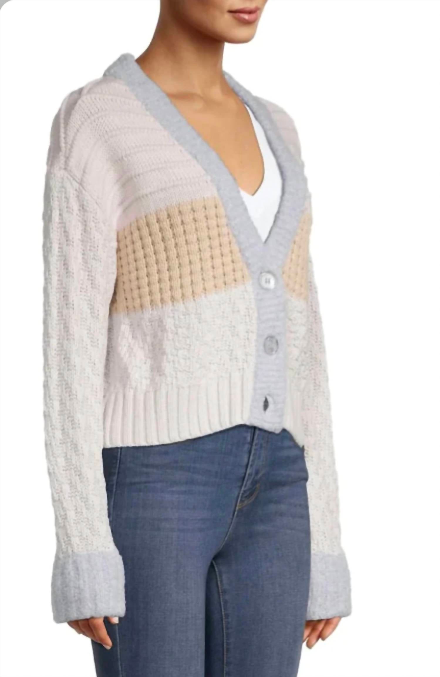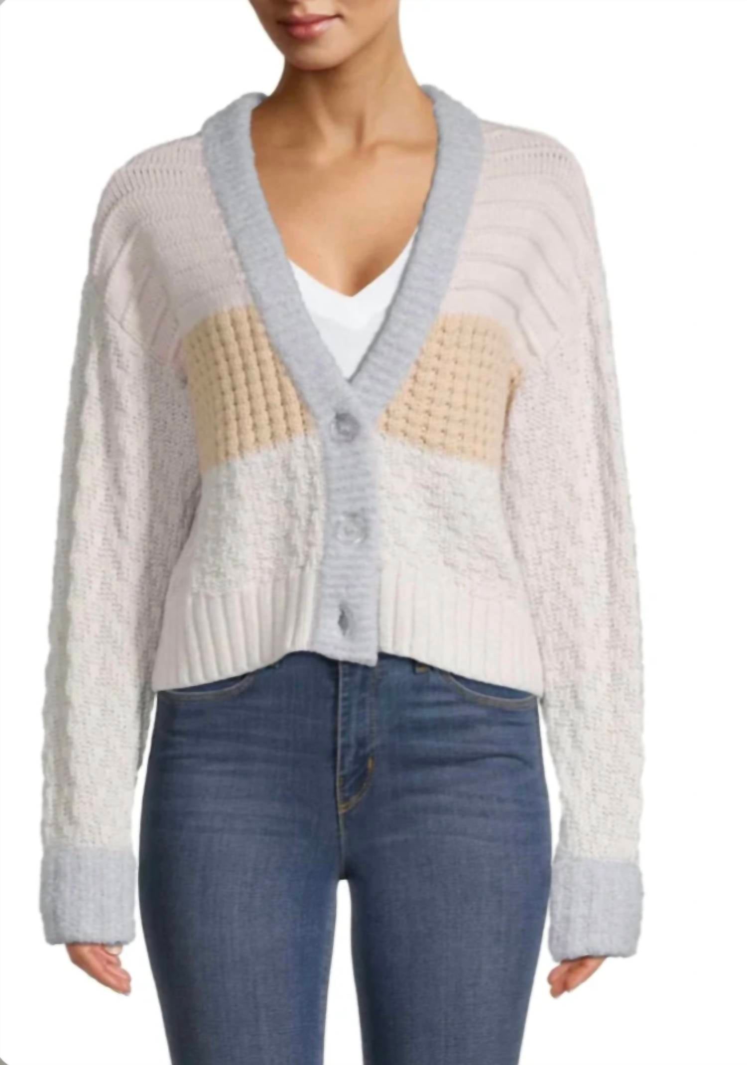This cardigan has a color-blocked design. This knit piece is styled with varying textures and relaxed dropped shoulders for cozy, comfortable wear.