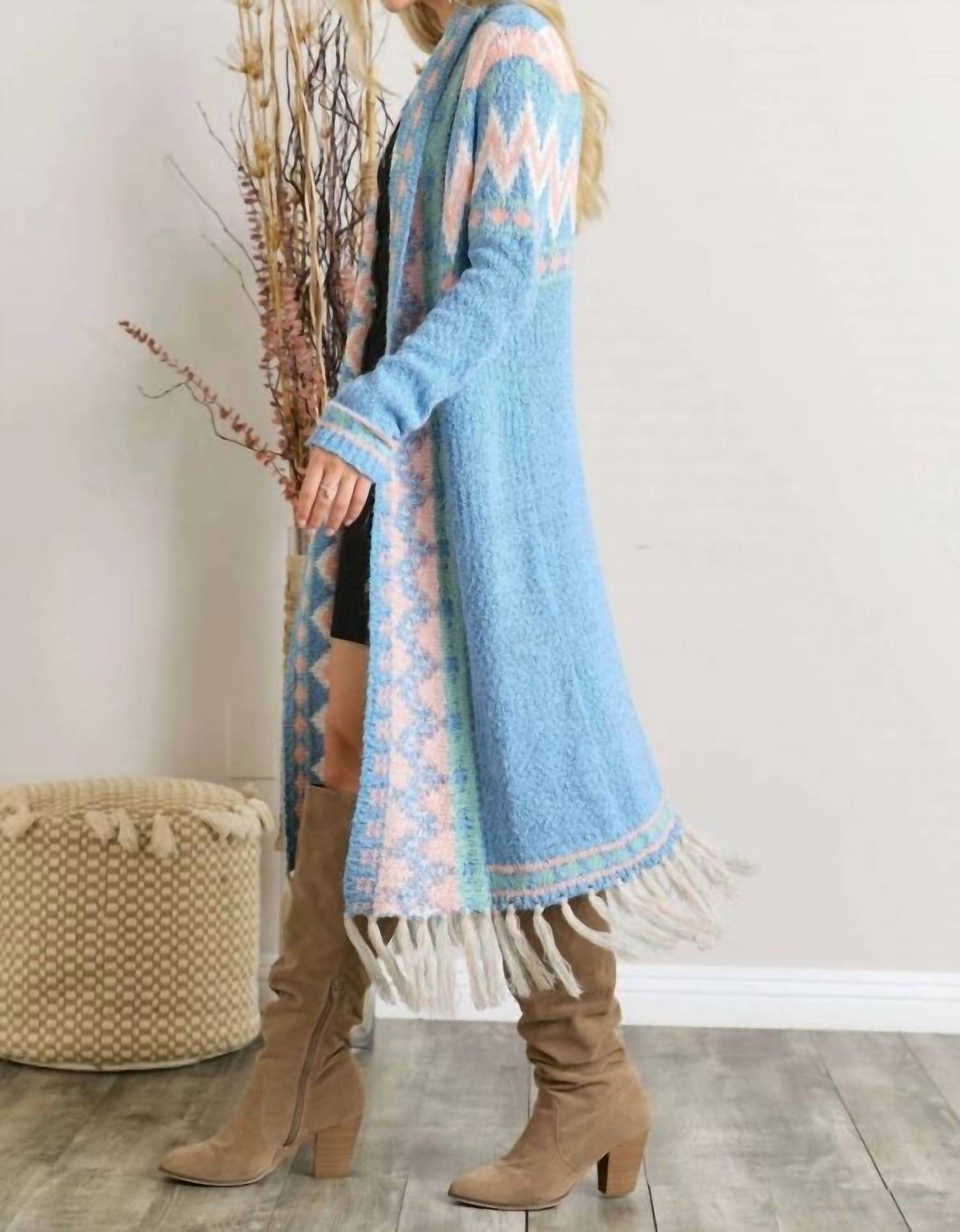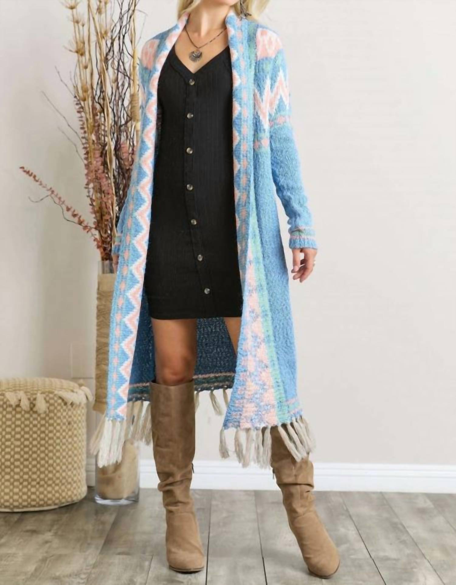 A classic fit that works just as good buttoned as it does left open.This Pretty And Feminine Sky Blue And Pastel Tribal Patterned Cardigan Is The One For You. Open Front Design With Tassel Detailing And Hits Below The Knees. You Will Enjoy This Beauty For Years To Come. Fabric: 65% Acrylic 35% Polyester. Made In China