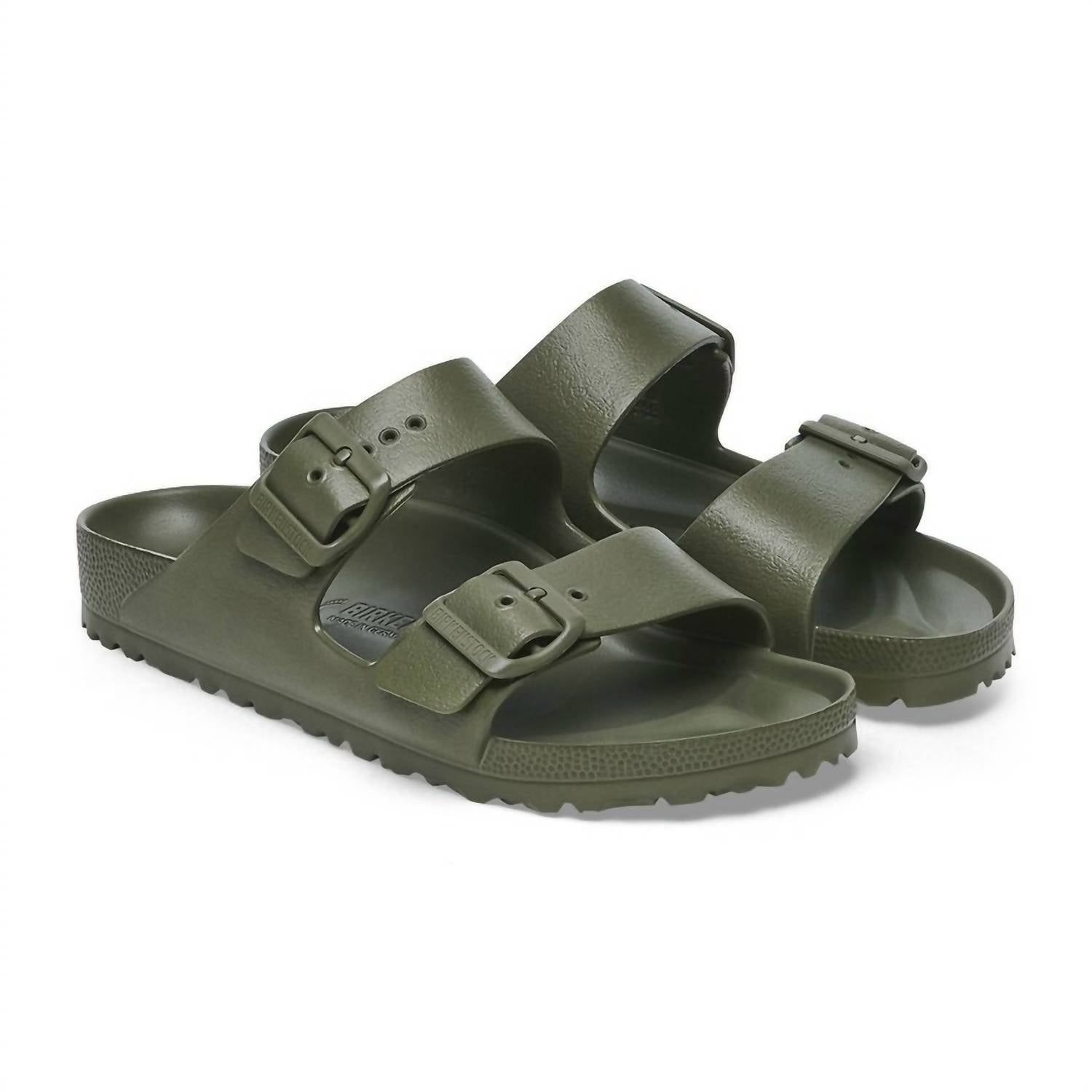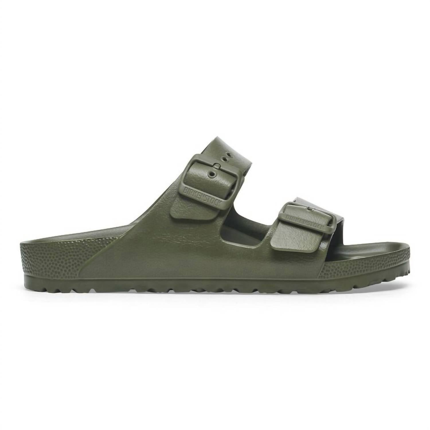 Meet the Unisex Arizona Eva Sandals by BIRKENSTOCK, a perfect blend of style and comfort in a classic khaki hue. Crafted from ultra-lightweight rubber with an anatomically shaped footbed, these sandals feature two individually adjustable pin buckle straps. Made in Germany, they are shock-absorbing, waterproof, and skin-friendly, ensuring all-day wearability whether at the beach or post-workout. Ideal for a medium fit with an open toe design, this flat heel sandal combines practical function with iconic style.